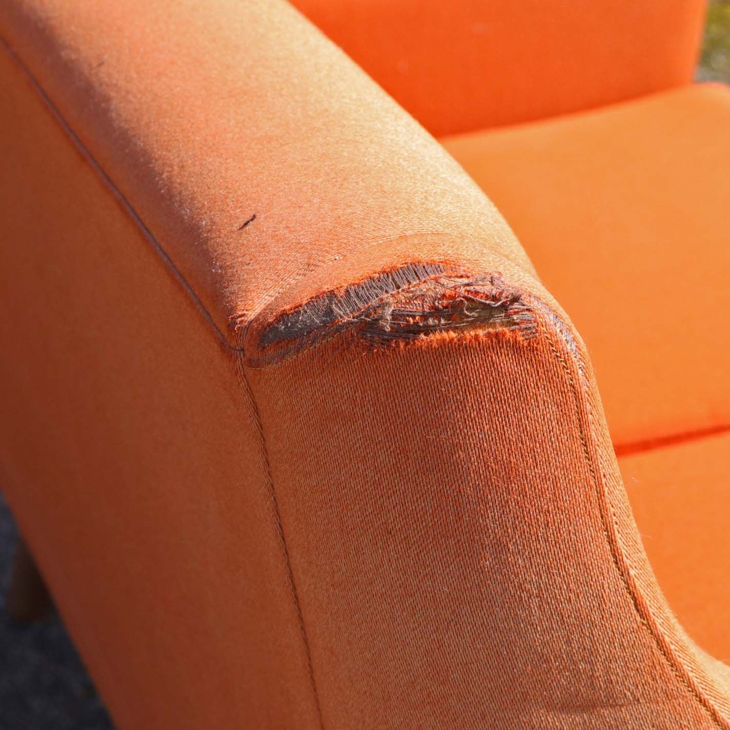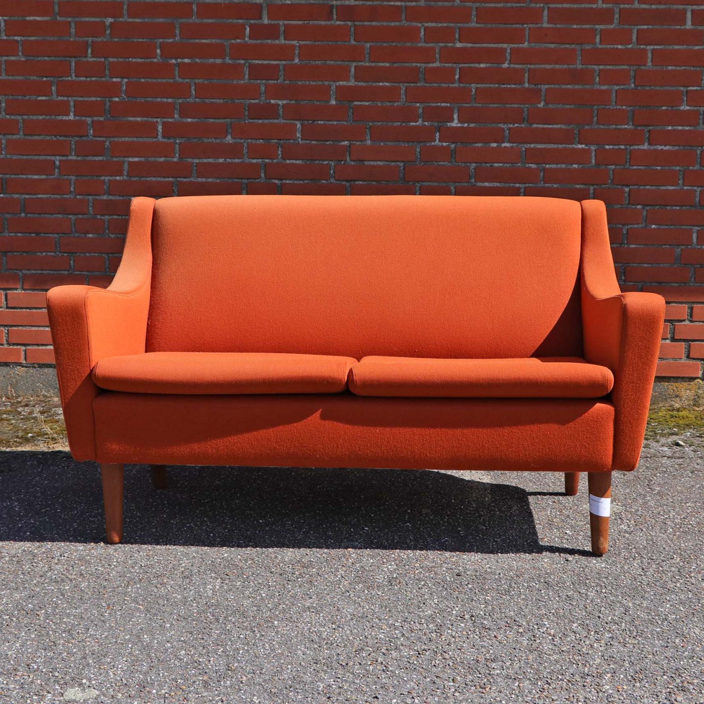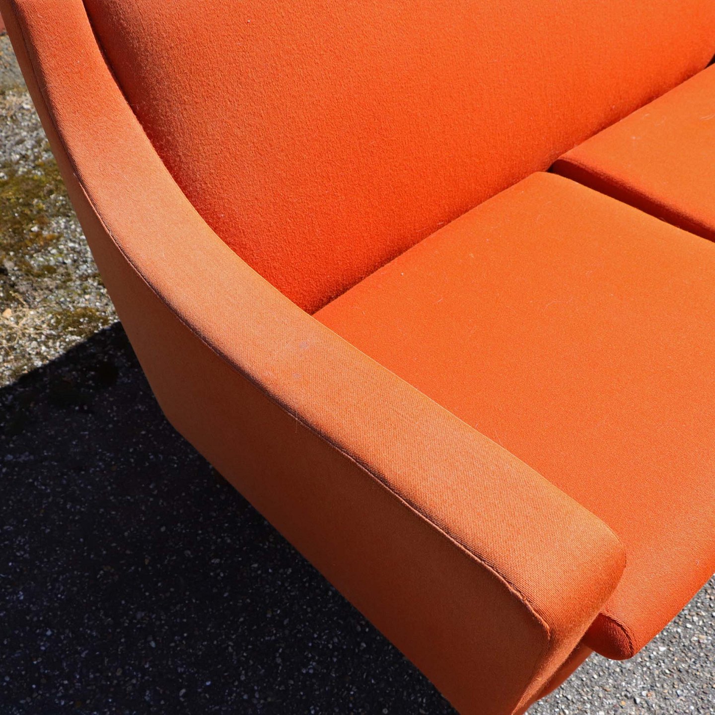To personers sofa med solfalmet orange uldbetræk og stel i teaktræ. Sofaen trænger til ombetrækning.