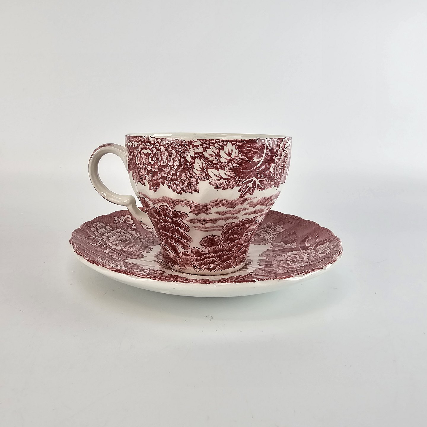 Kaffekop med underkop fra det engelske stel Rød Paris (Enoch wood's, English scenery)