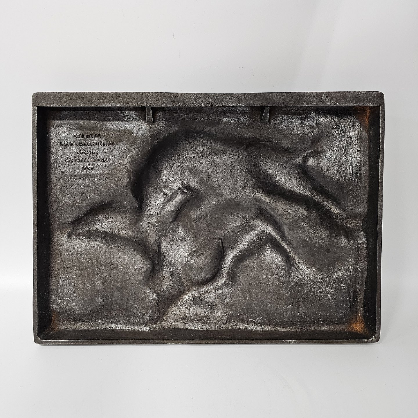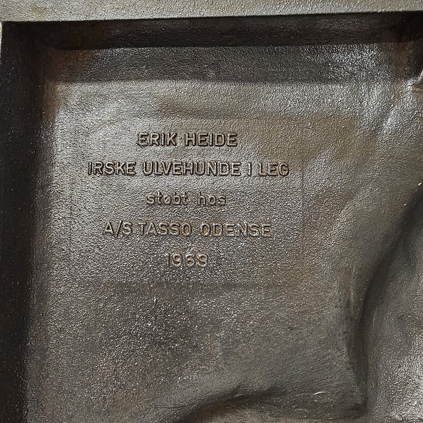Relief i støbejern med titlen Irske ulvehunde i leg. Dateret 1969