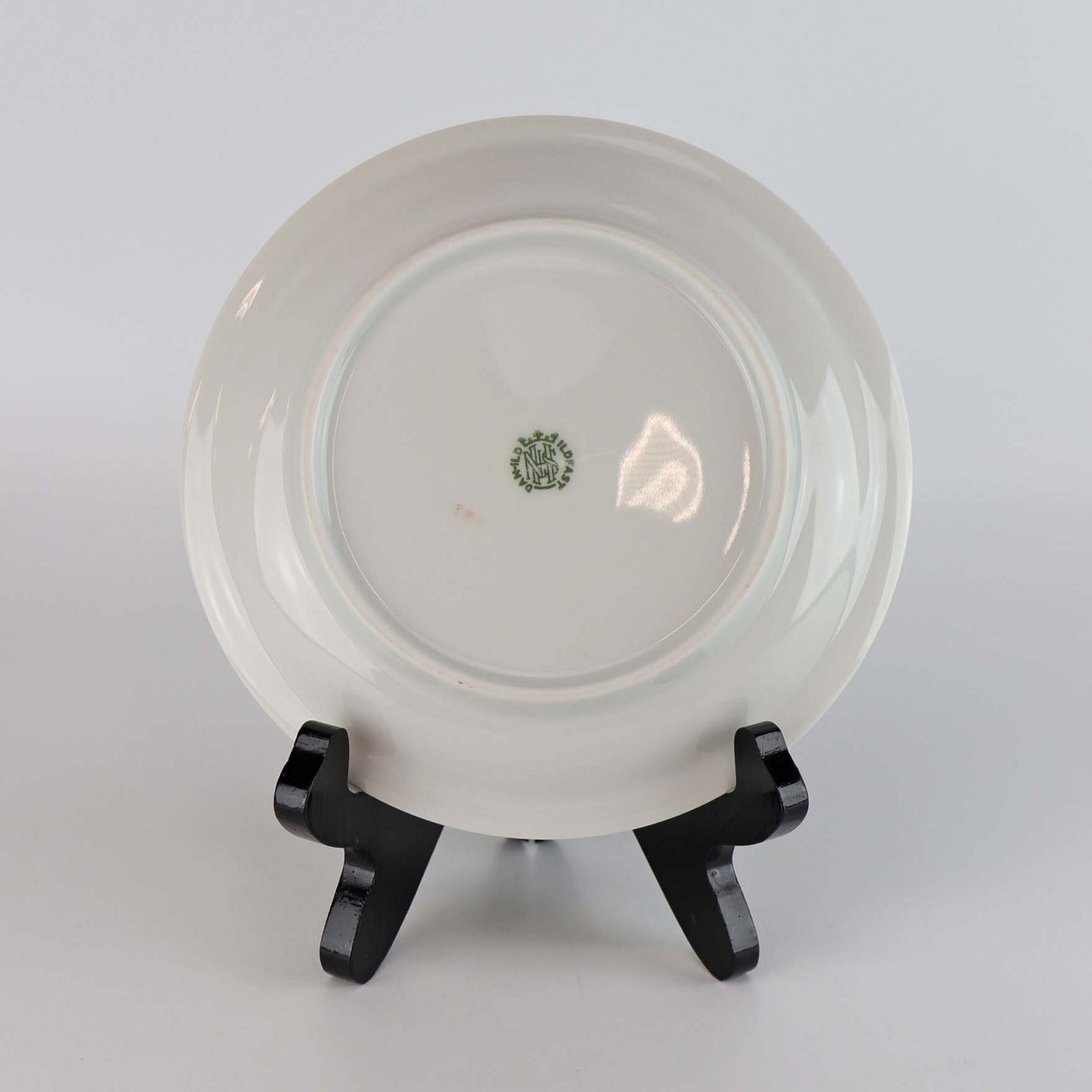 Service i glat hvidt porcelæn, som er påført en cirkel af lotusblade. Stellet er produceret i flere farver
