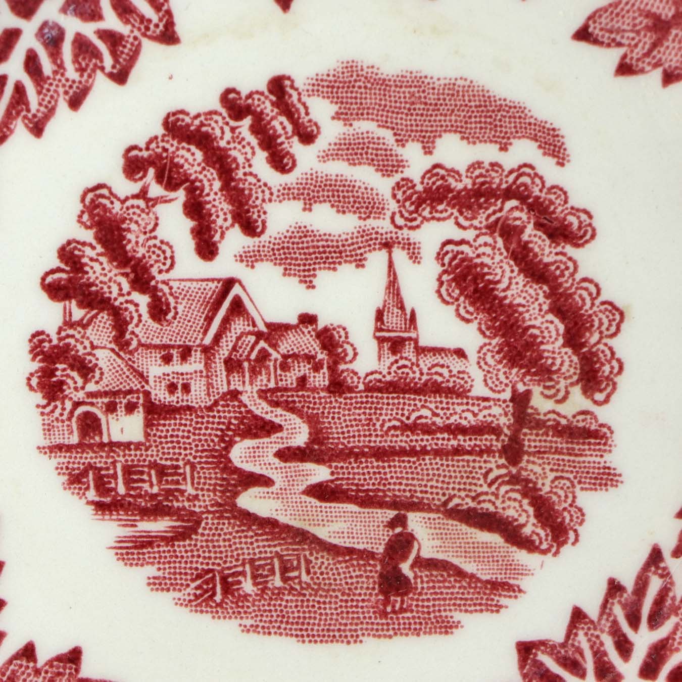 Rød Paris er af engelsk fajance dekoreret med forskellige landskaber og blomster i kanten, alt i forskellige røde nuancer