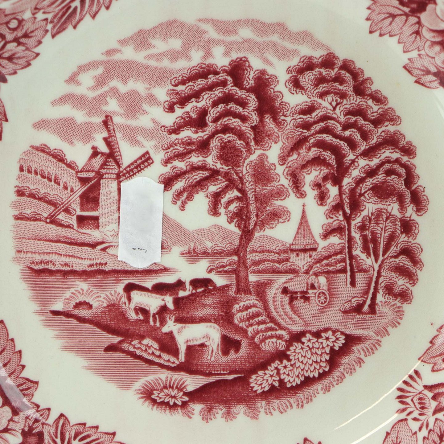 Rød Paris er af engelsk fajance dekoreret med forskellige landskaber og blomster i kanten, alt i forskellige røde nuancer