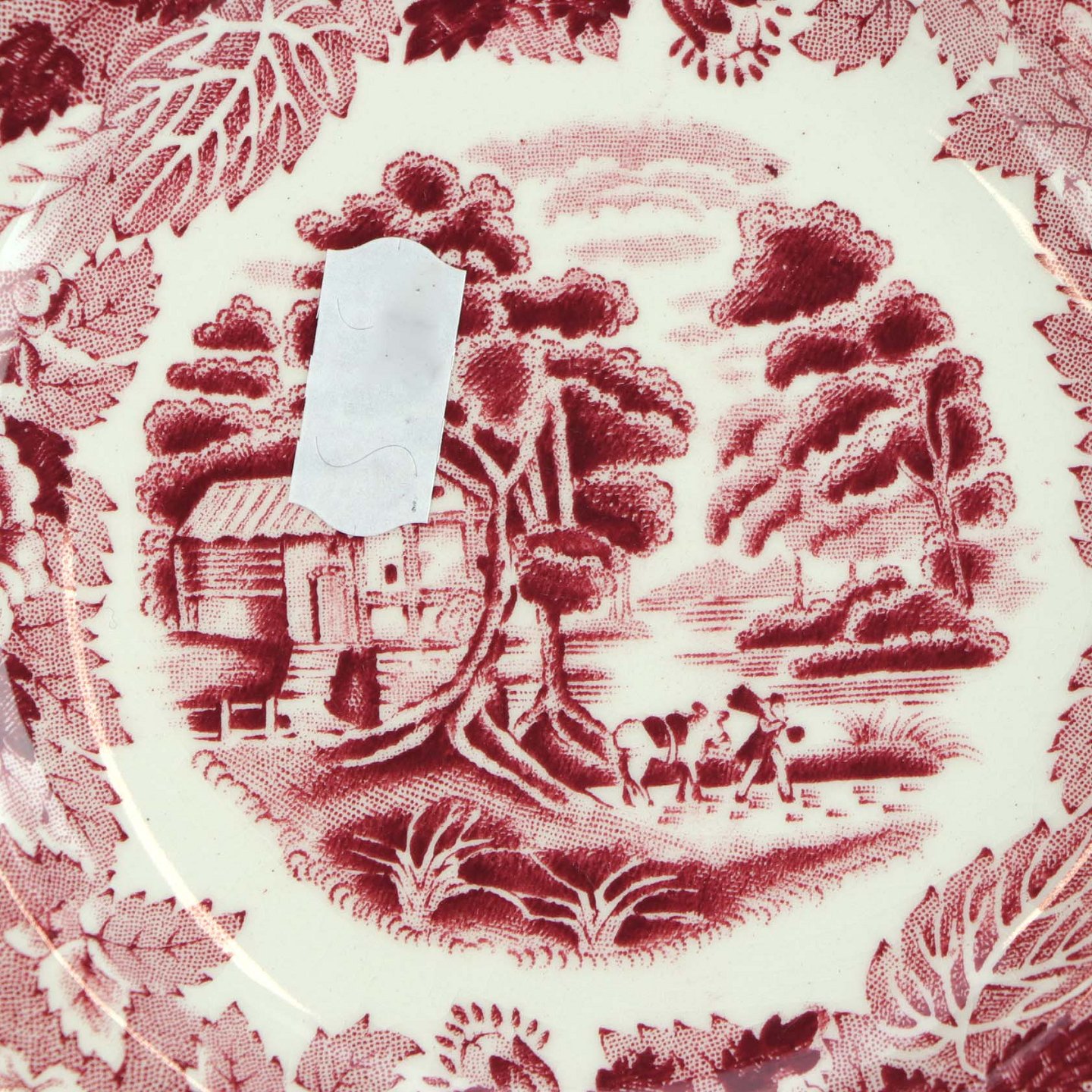 Rød Paris er af engelsk fajance dekoreret med forskellige landskaber og blomster i kanten, alt i forskellige røde nuancer