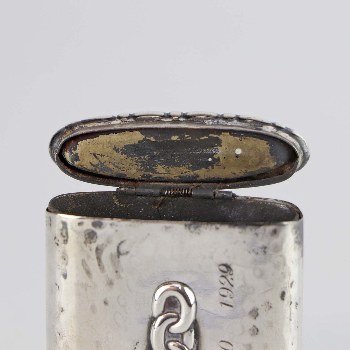Tændstiksetui i tretåret banket sølv med fjeder åbning og indgraveret skrift 1879 16-10 1929