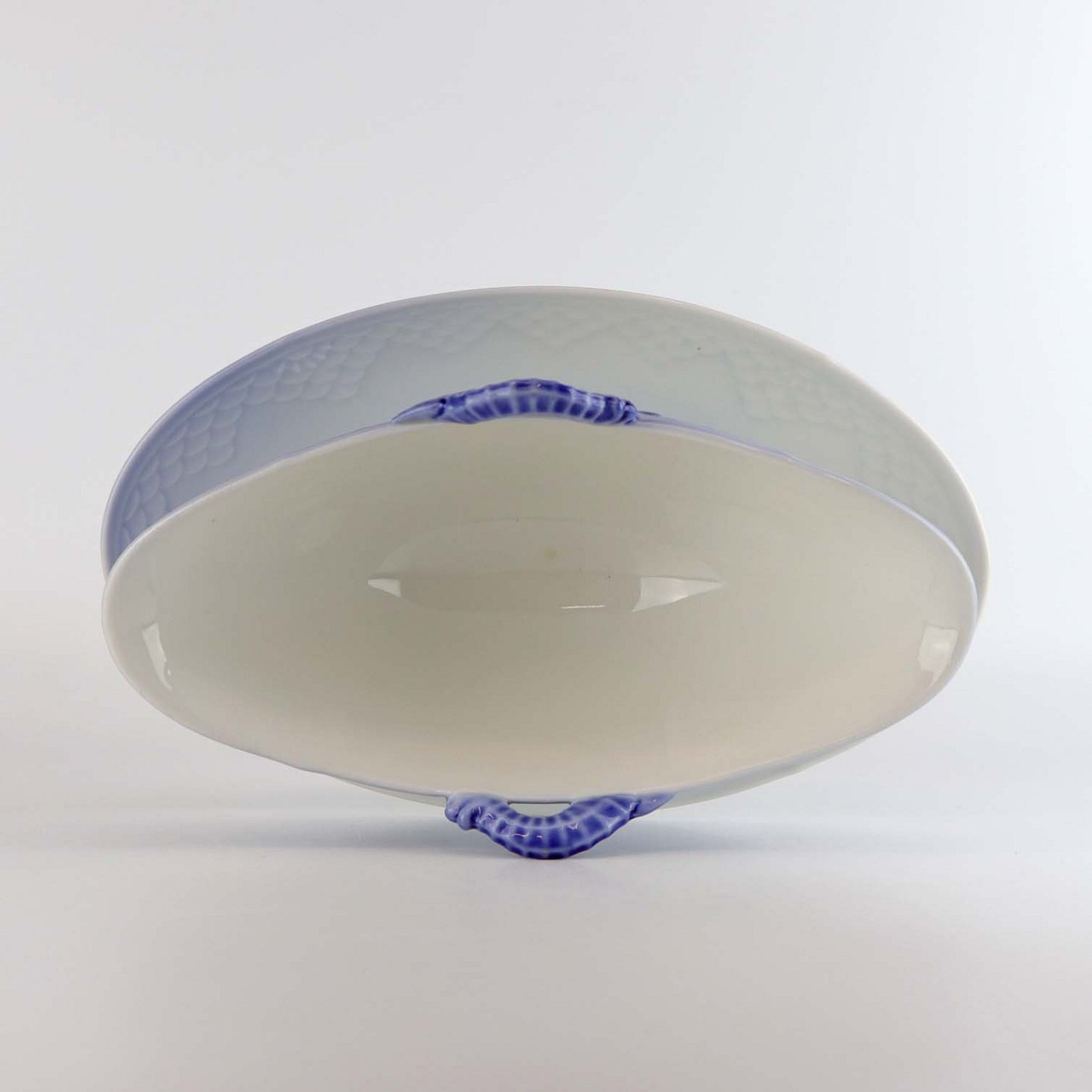 Service i glat porcelæn med skælform i blålige farver og motiv af måger