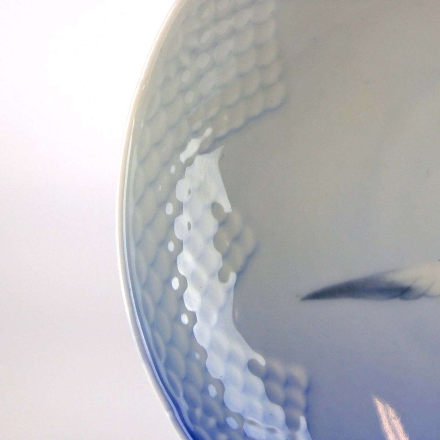 Service i glat porcelæn med skælform i blålige farver og motiv af måger