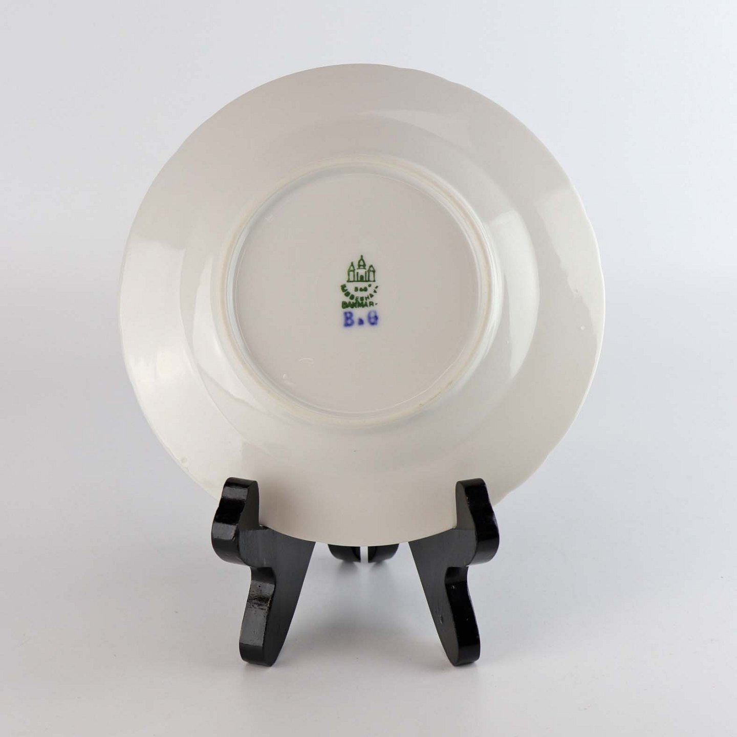 Service i glat porcelæn med skælform i blålige farver og motiv af måger