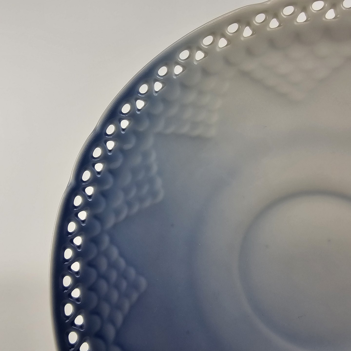 Service i glat porcelæn med skælform i blålige farver og motiv af måger