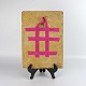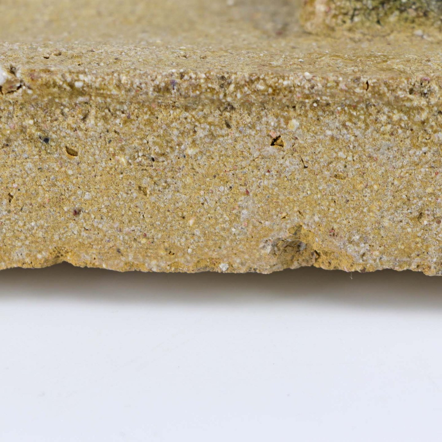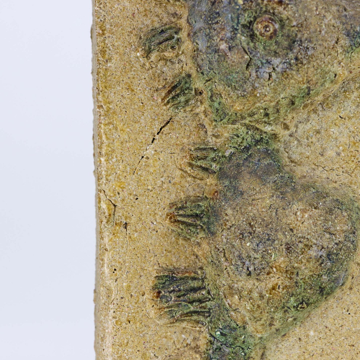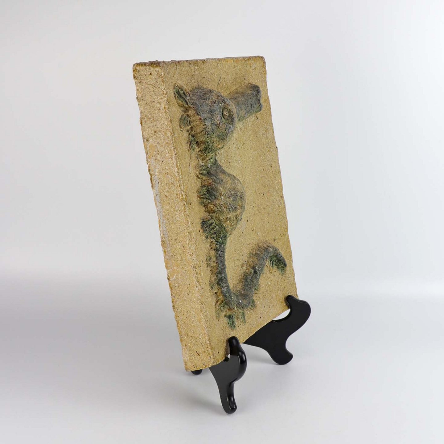 Relief i keramik med motiv af en grønlig søhest på gullig bagrund