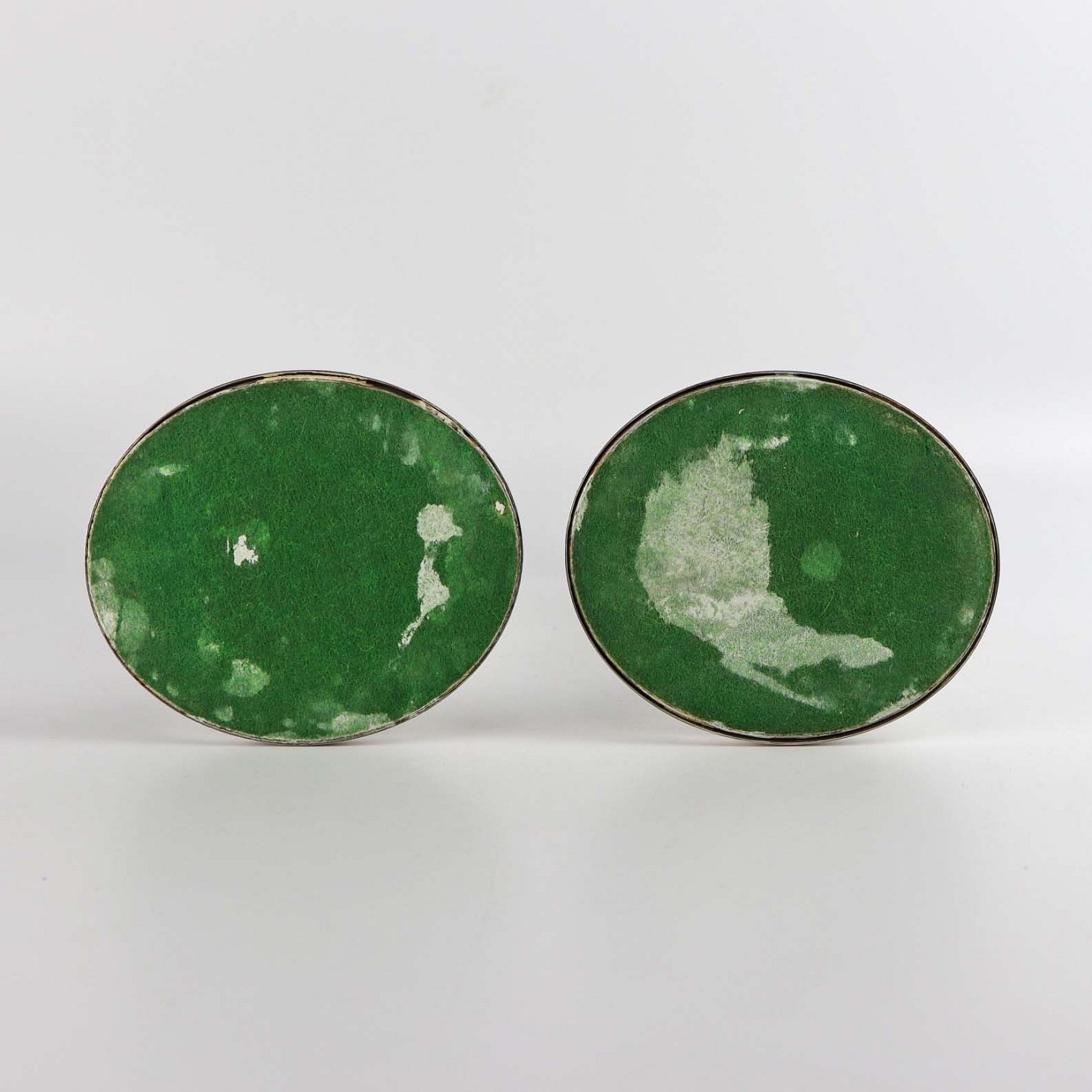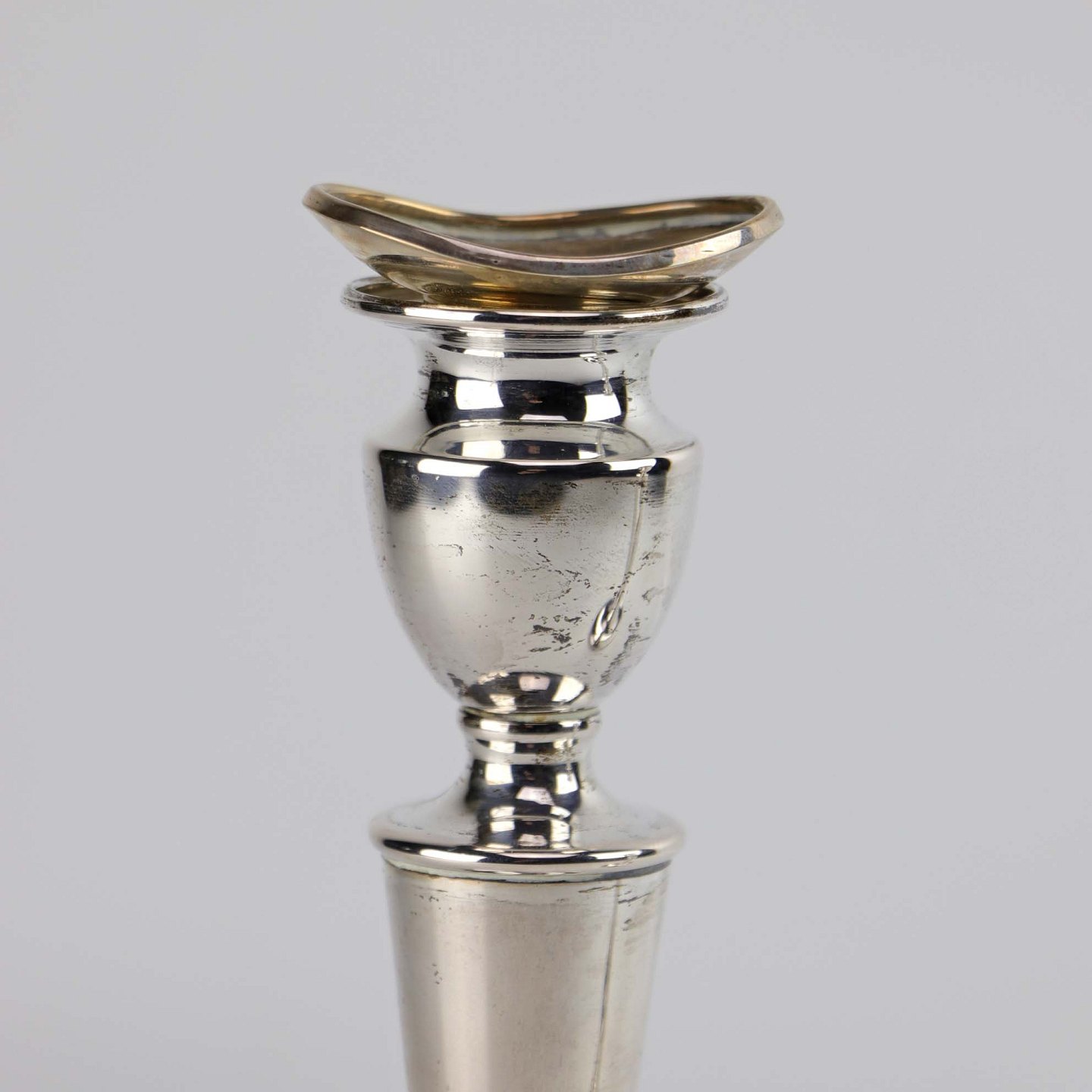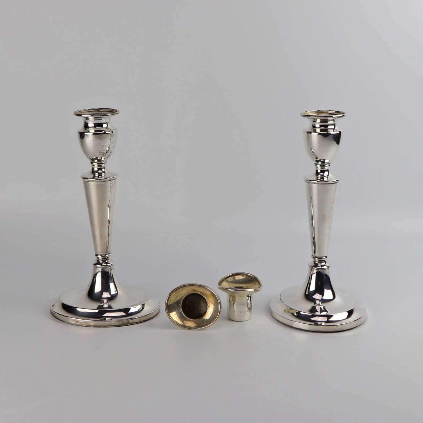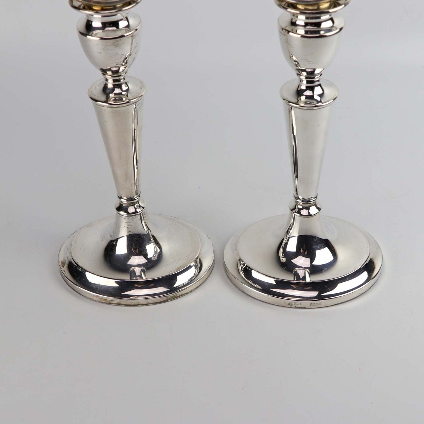 Et sæt lysestager i sølv med oval fod og aftagelige toppe