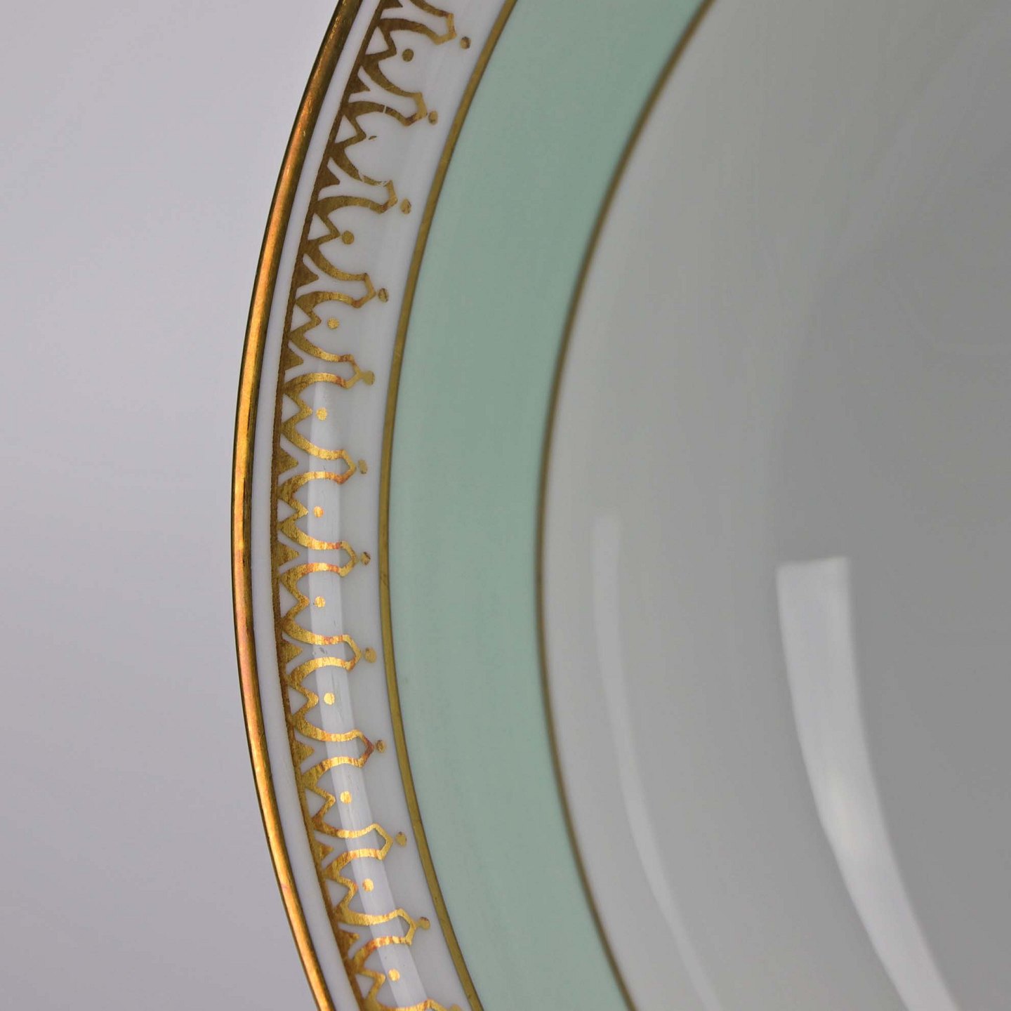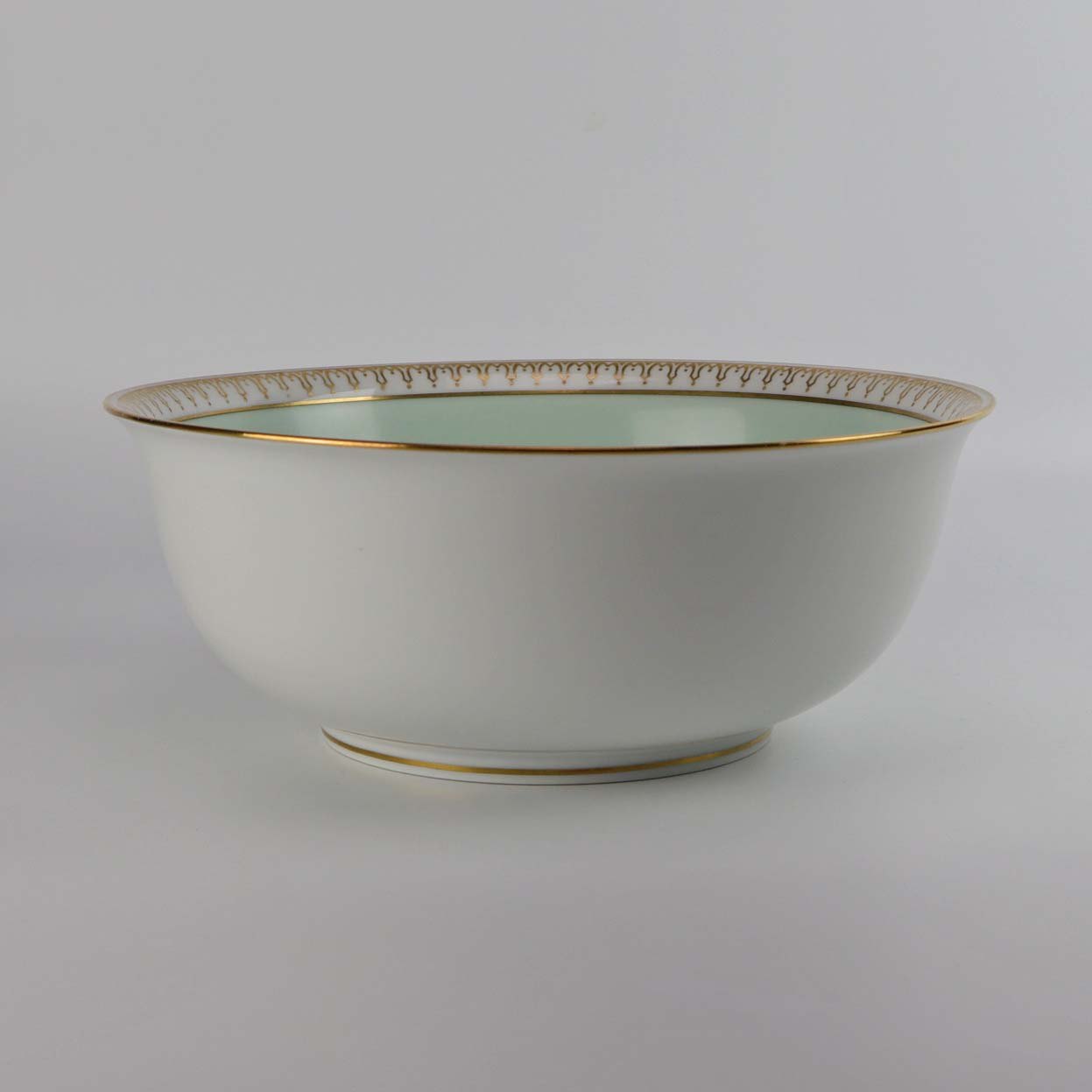 Salatskålen er i glat hvidt porcelæn med lysgrøn bord og forgyldt dekoration