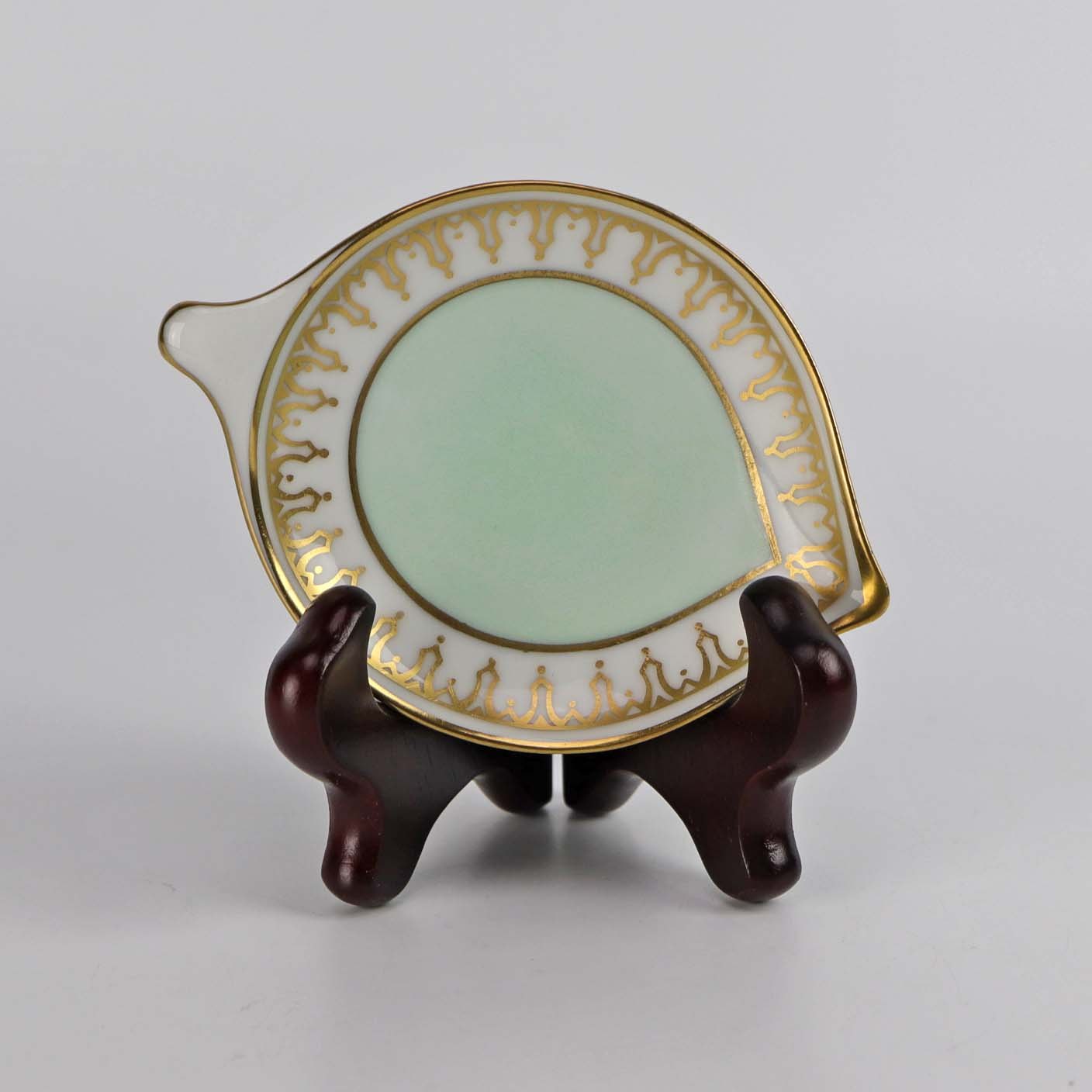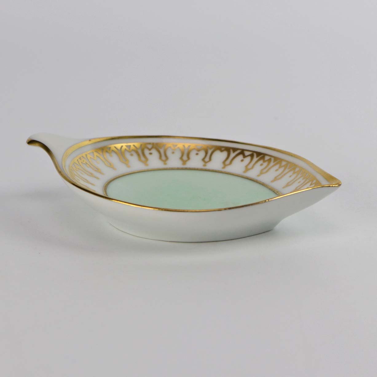 Smørkuvert i glat hvidt porcelæn med lysgrøn bord og forgyldt dekoration