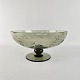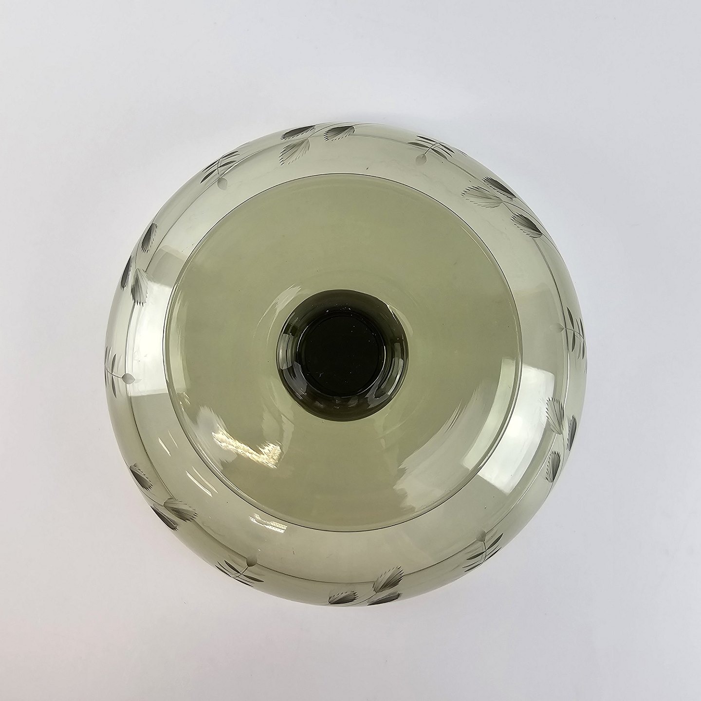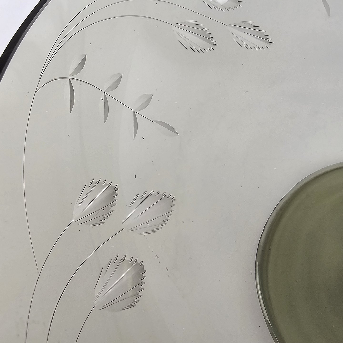 Opsats i glas af svagt grøn farve med fod i en mørkere grøn farve. Dekoreret med graveret grene med blade