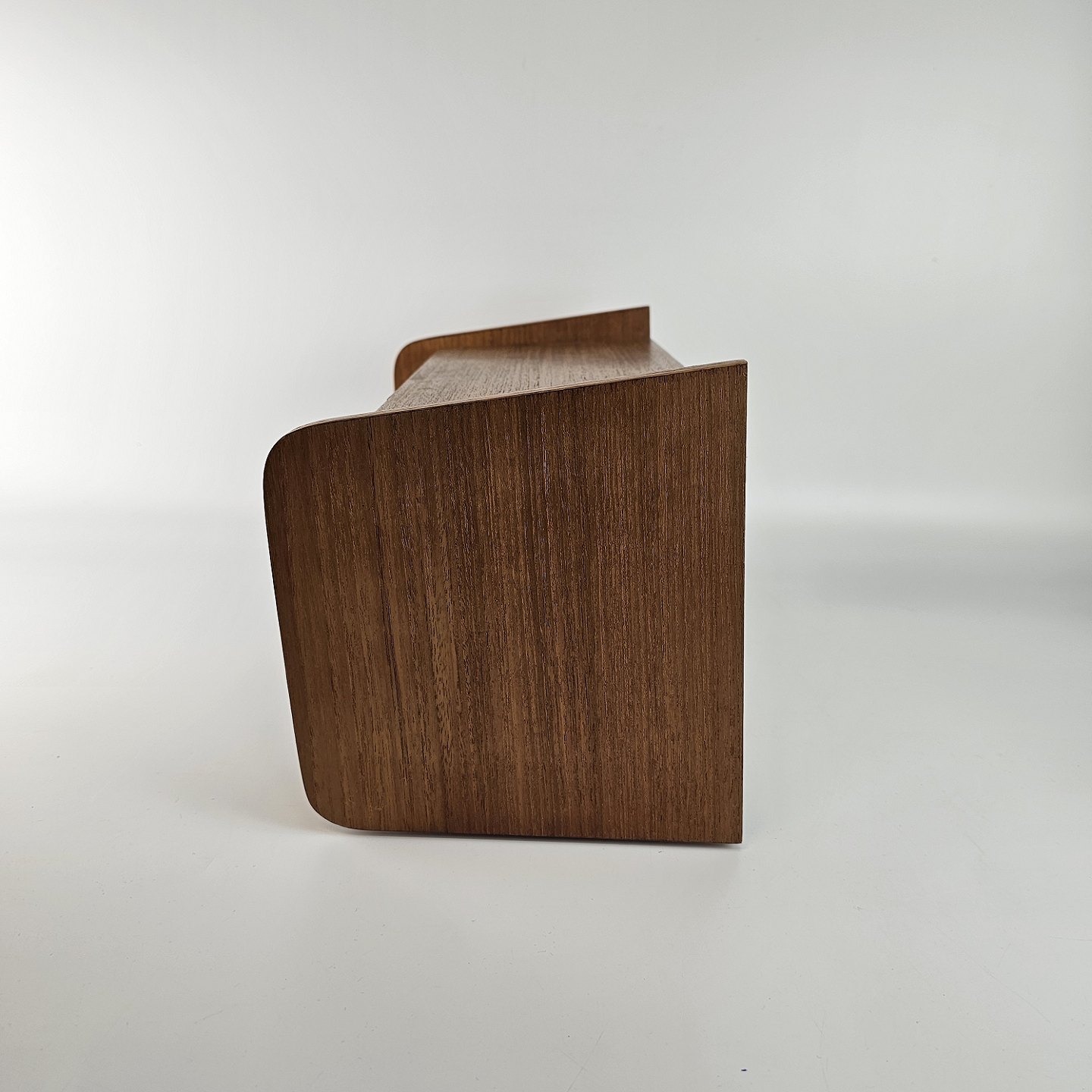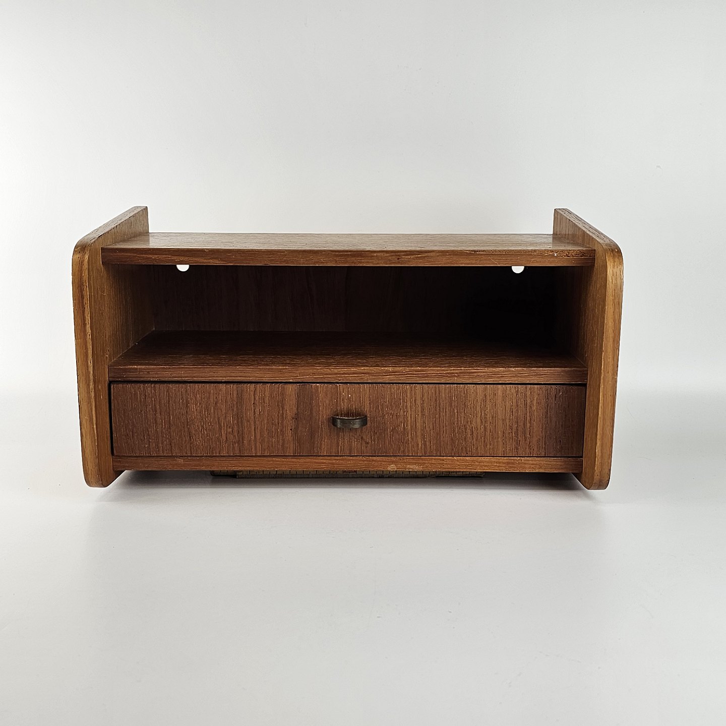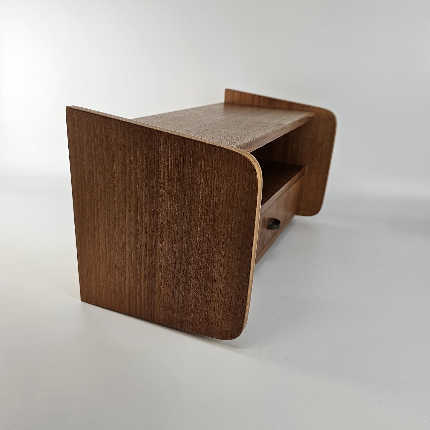 To væghængt natborde af teaktræ. 1 skuffe og 1 hylde