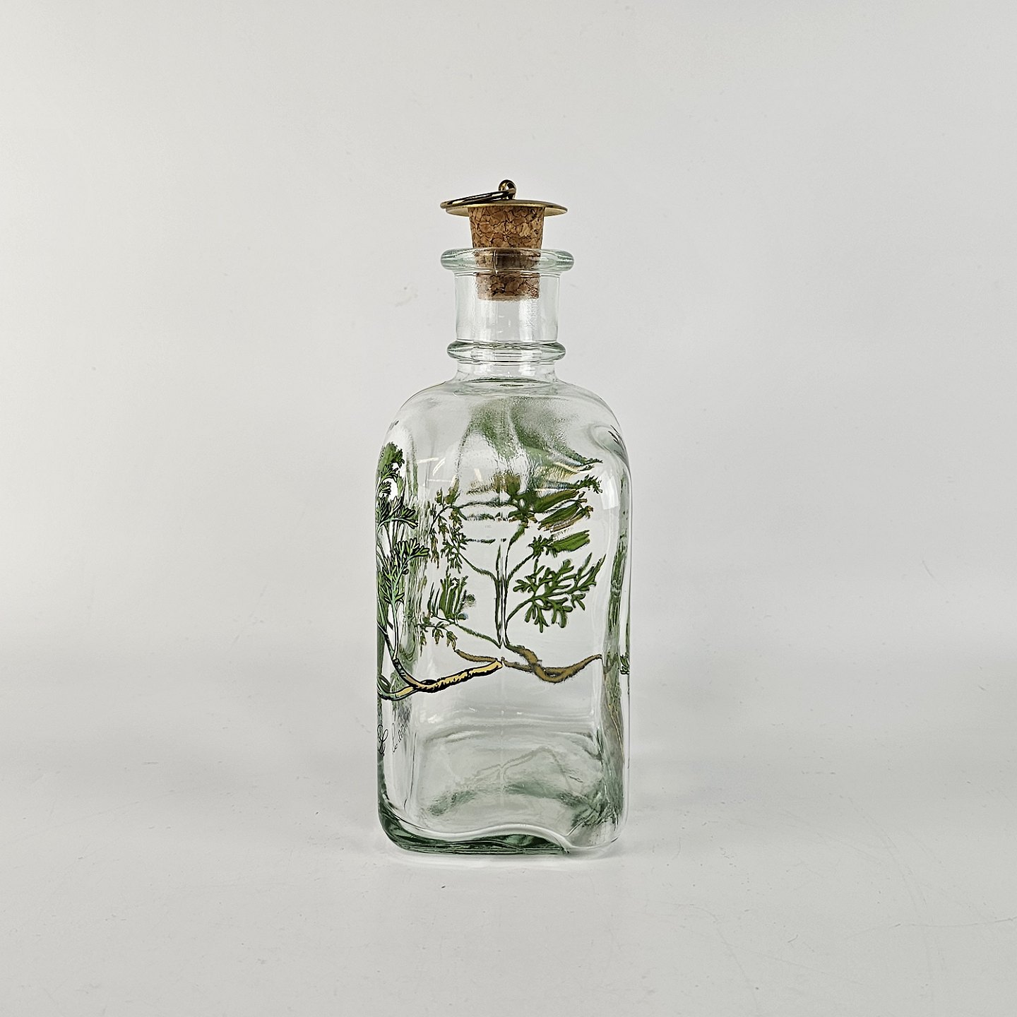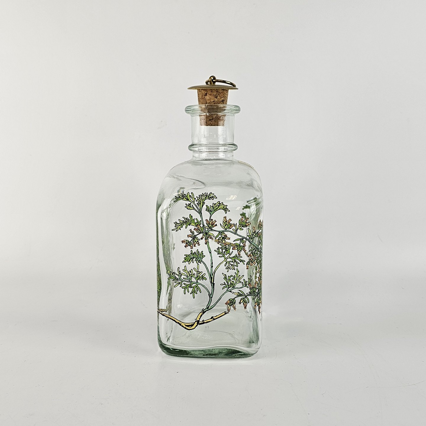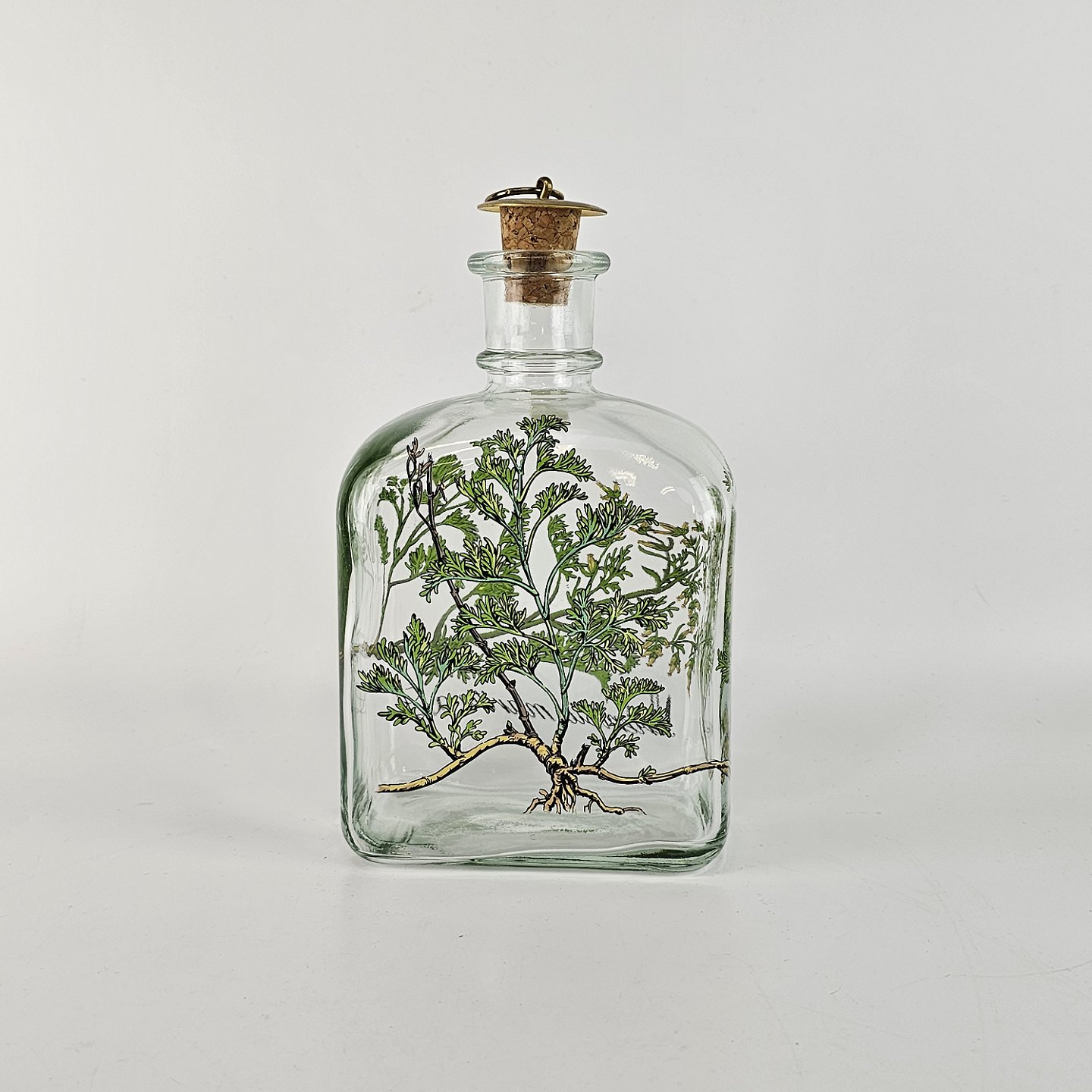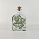 Firkantet karaffel med buet top og tilhørende korkprop. Dekoreret med en gren af malurt, der slynger sig om karaflen og teksten Artemisia maritima L.