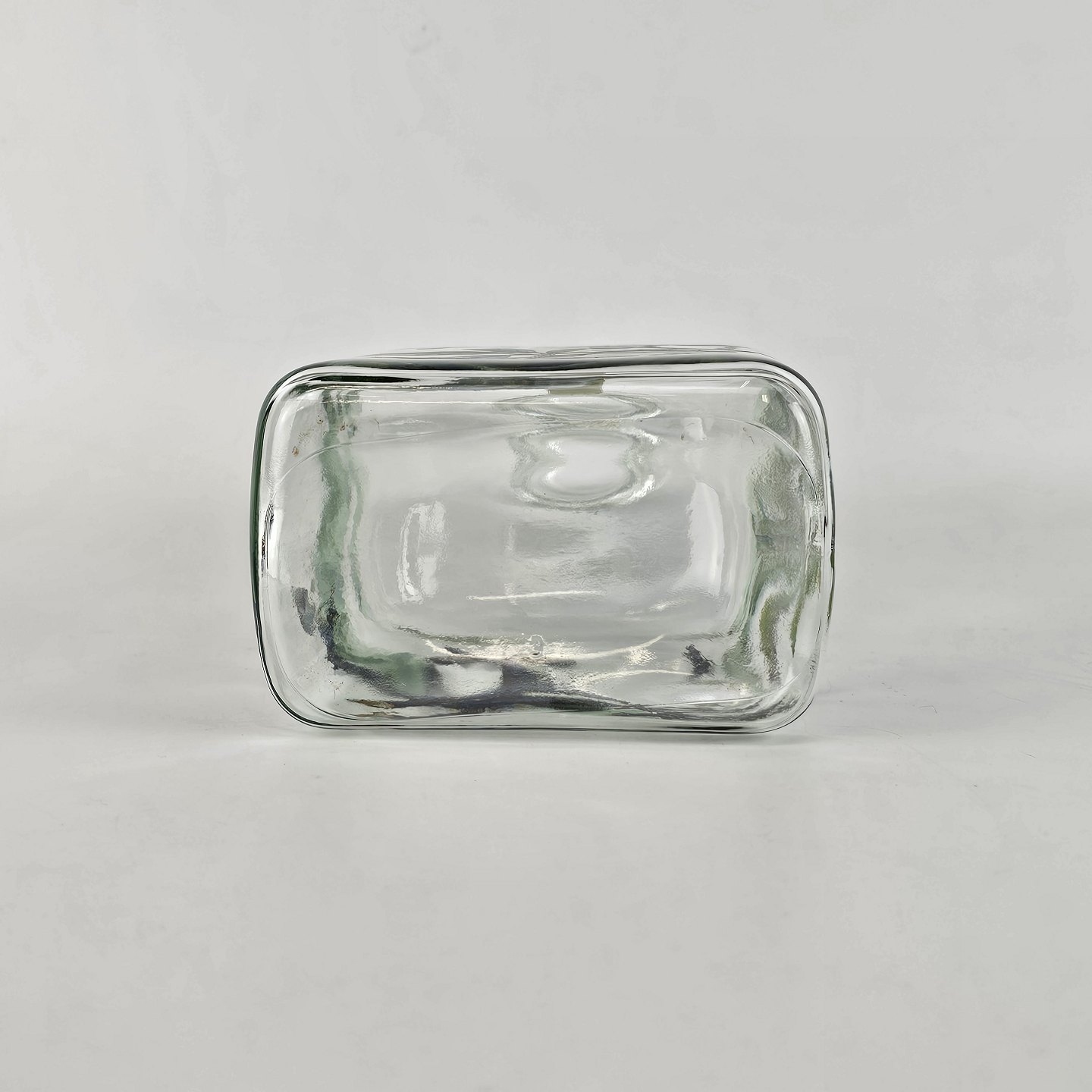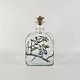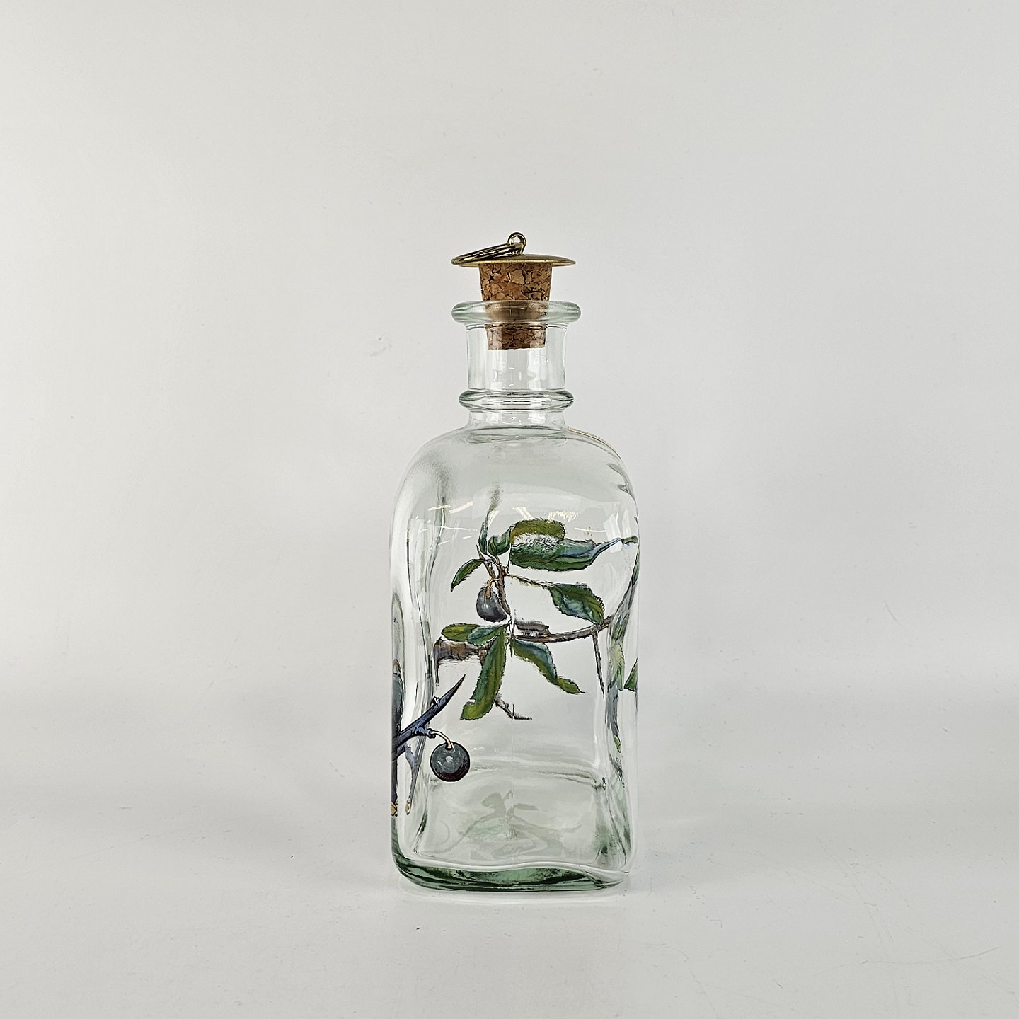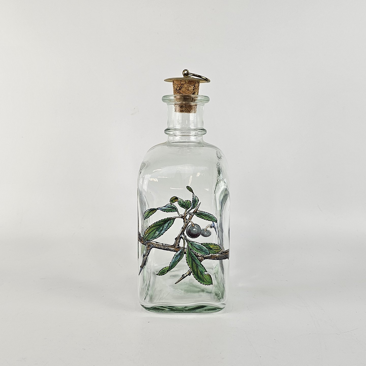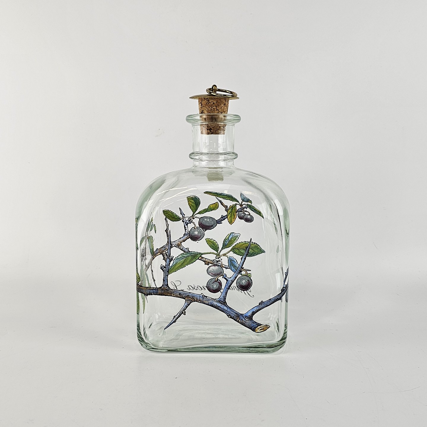 Firkantet karaffel med buet top og tilhørende korkprop. Dekoreret med en gren af slåen, der slynger sig om karaflen og teksten Prunus spinosa L.