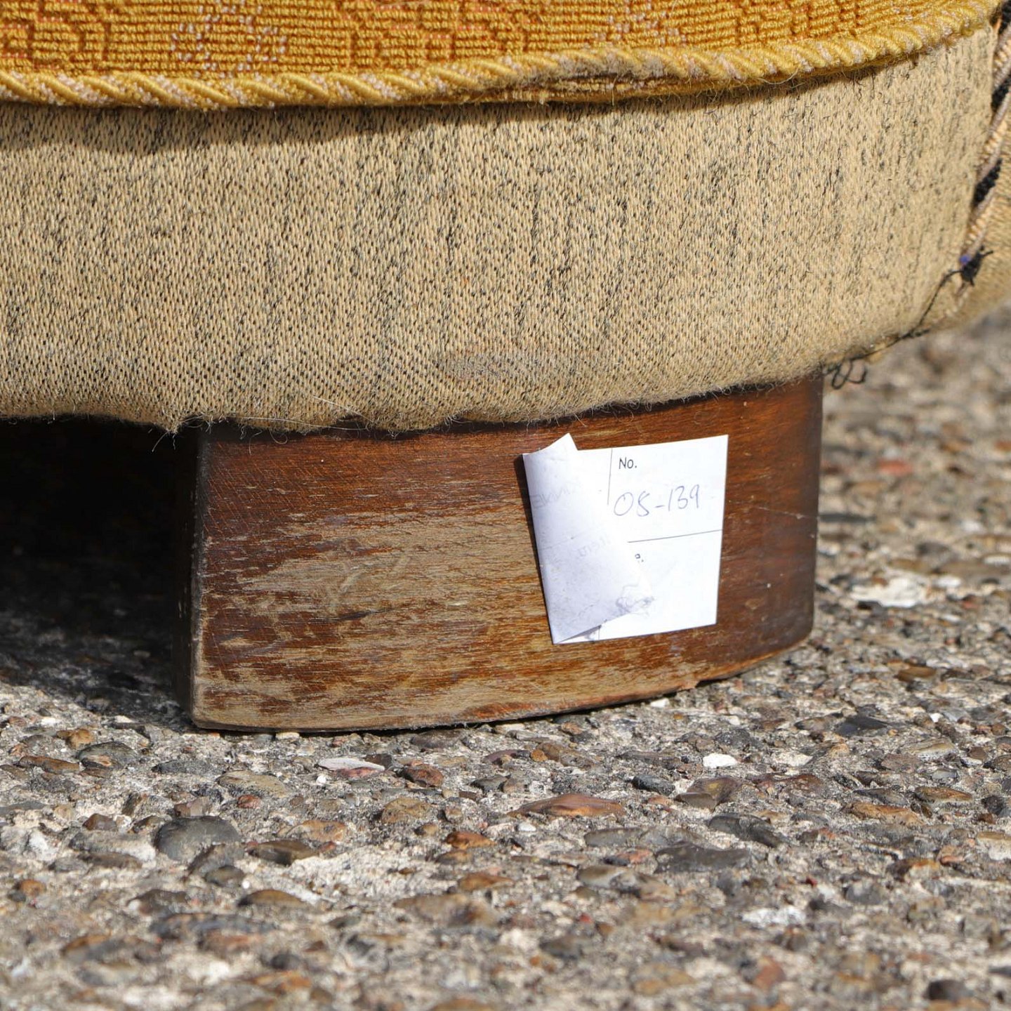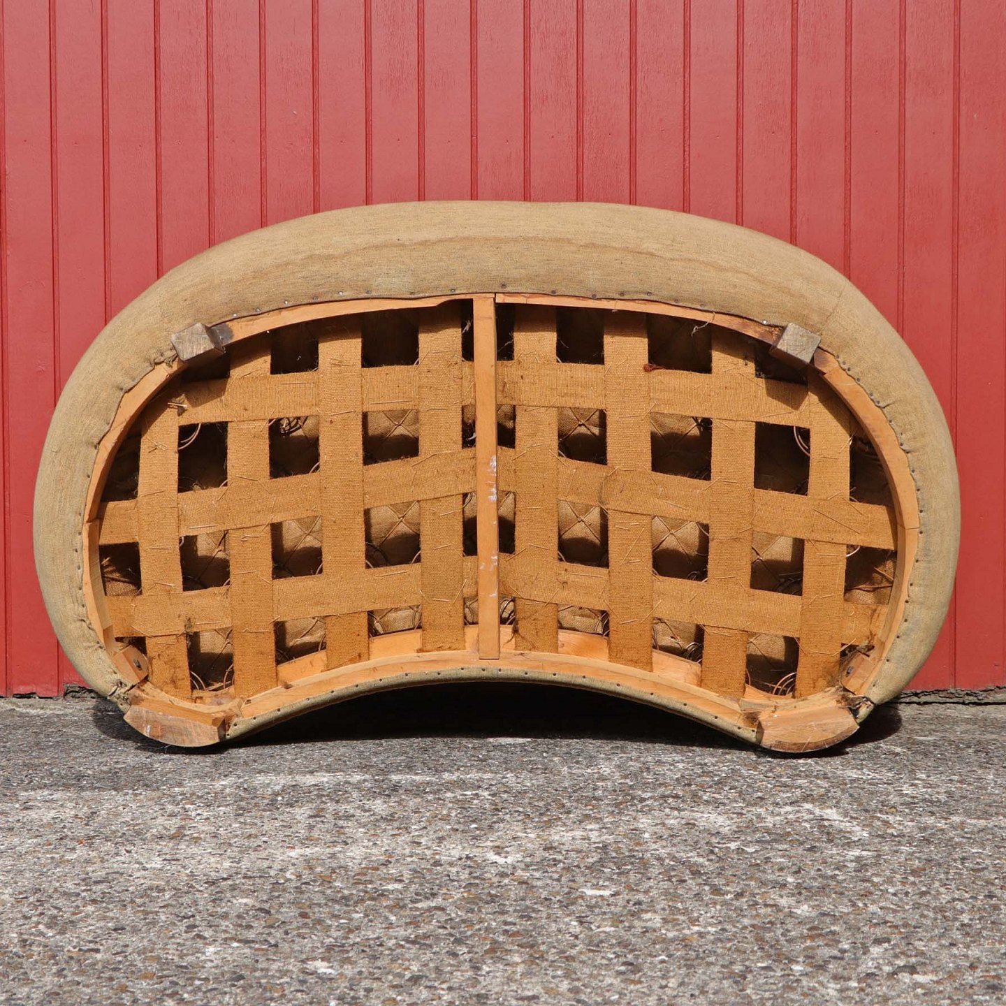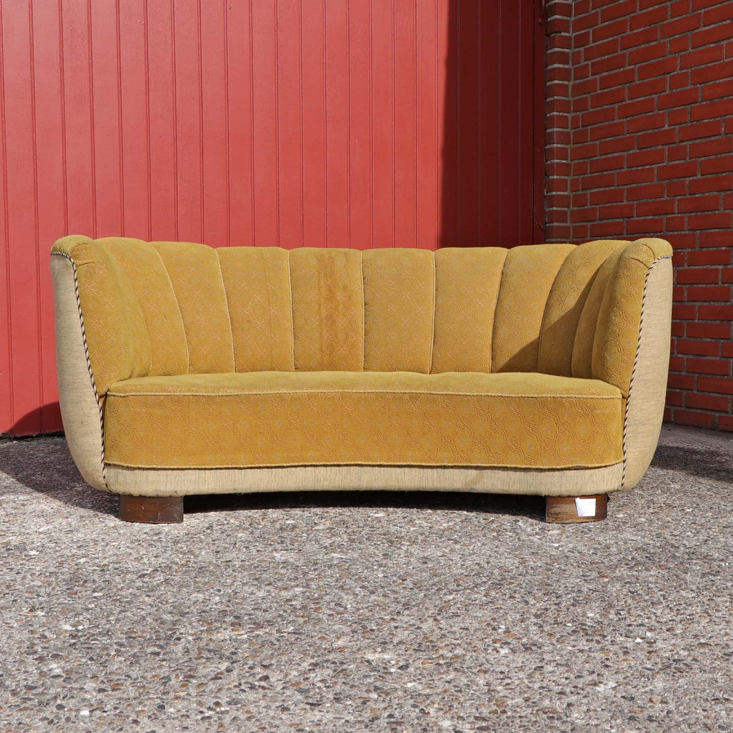 Ældre to personers sofa med form som en banan. Sofaen har sæde af springfjeder og er betrukket med slidtstærkt grøngul mønstret stof og mørk lakeret træben.