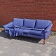 Tre personers sofa med stel i lakeret teaktræ. Sofaen er betrukket med et multifarvet glat stof og ekstra stof medfølger.