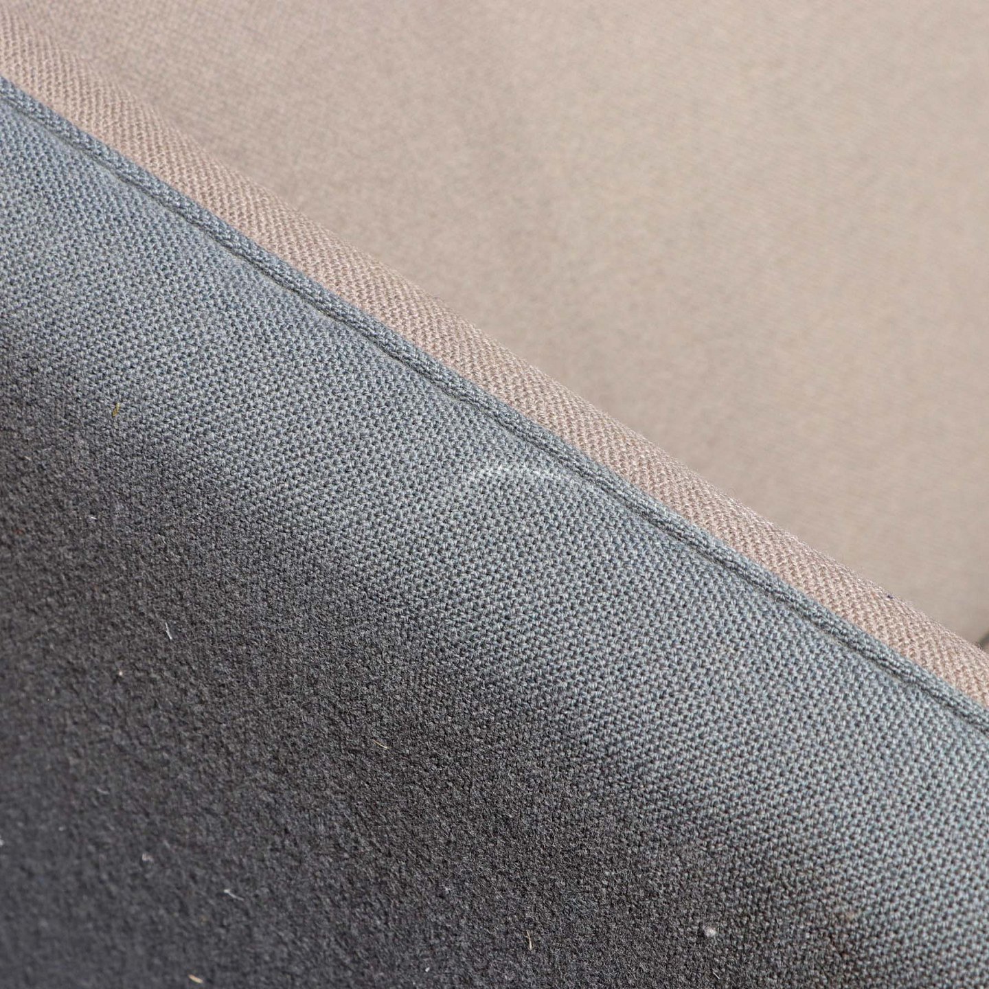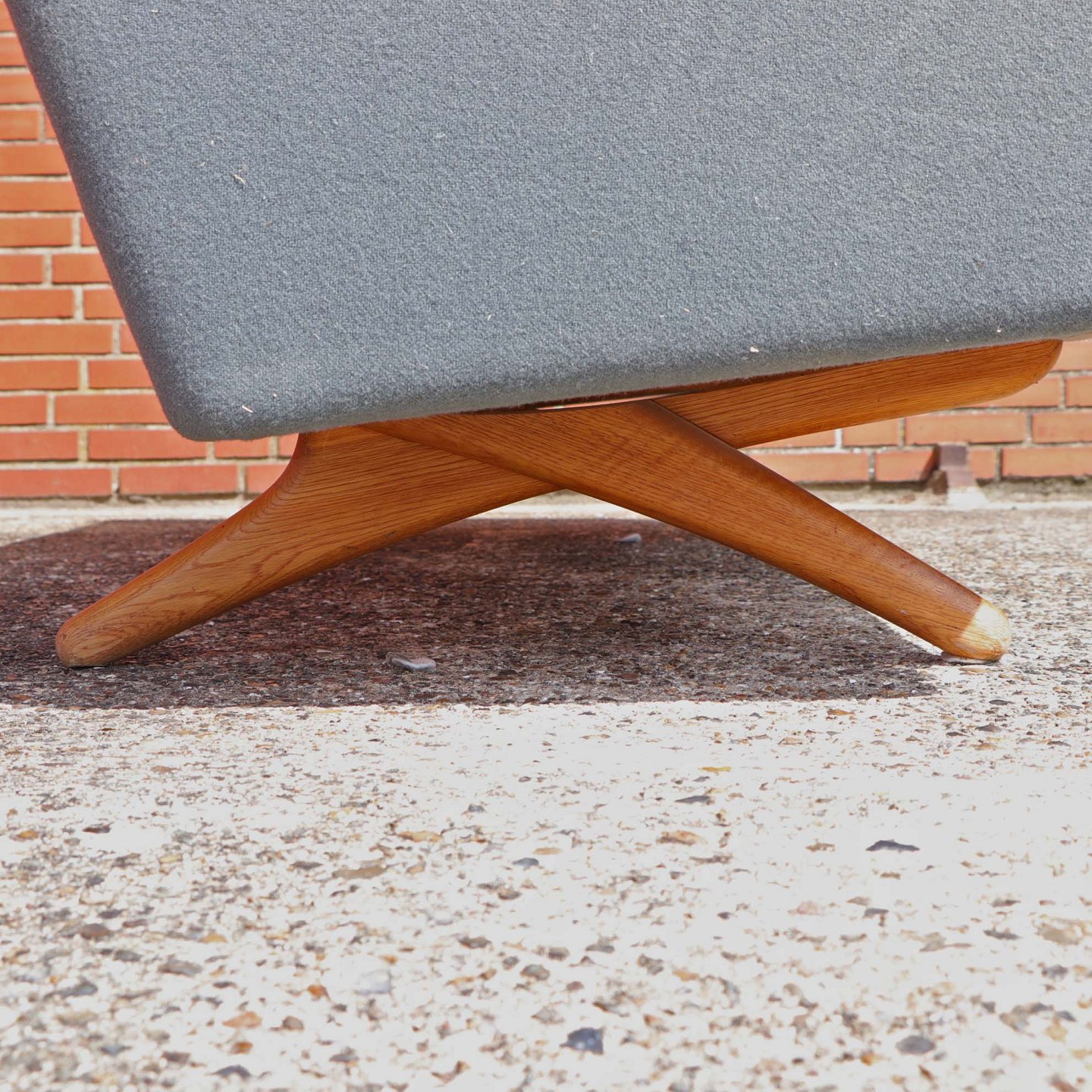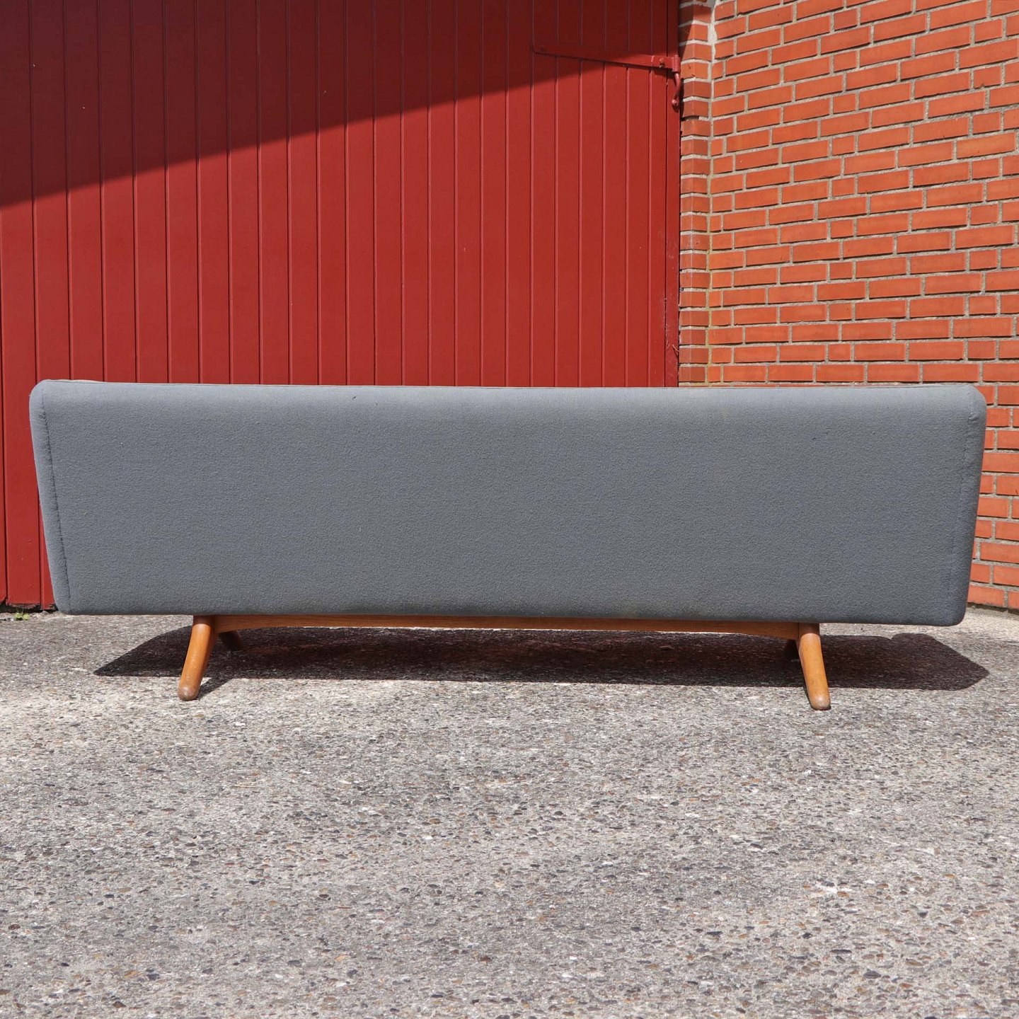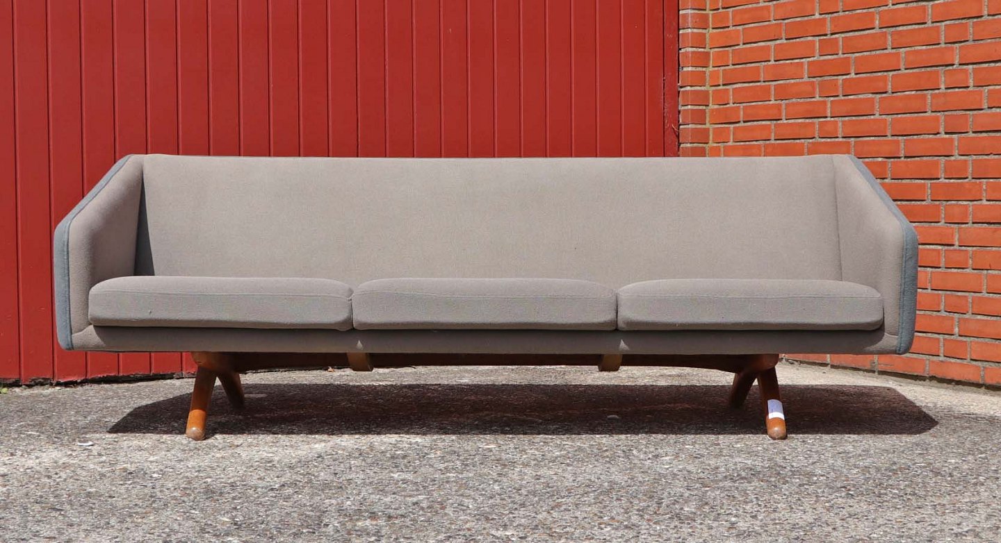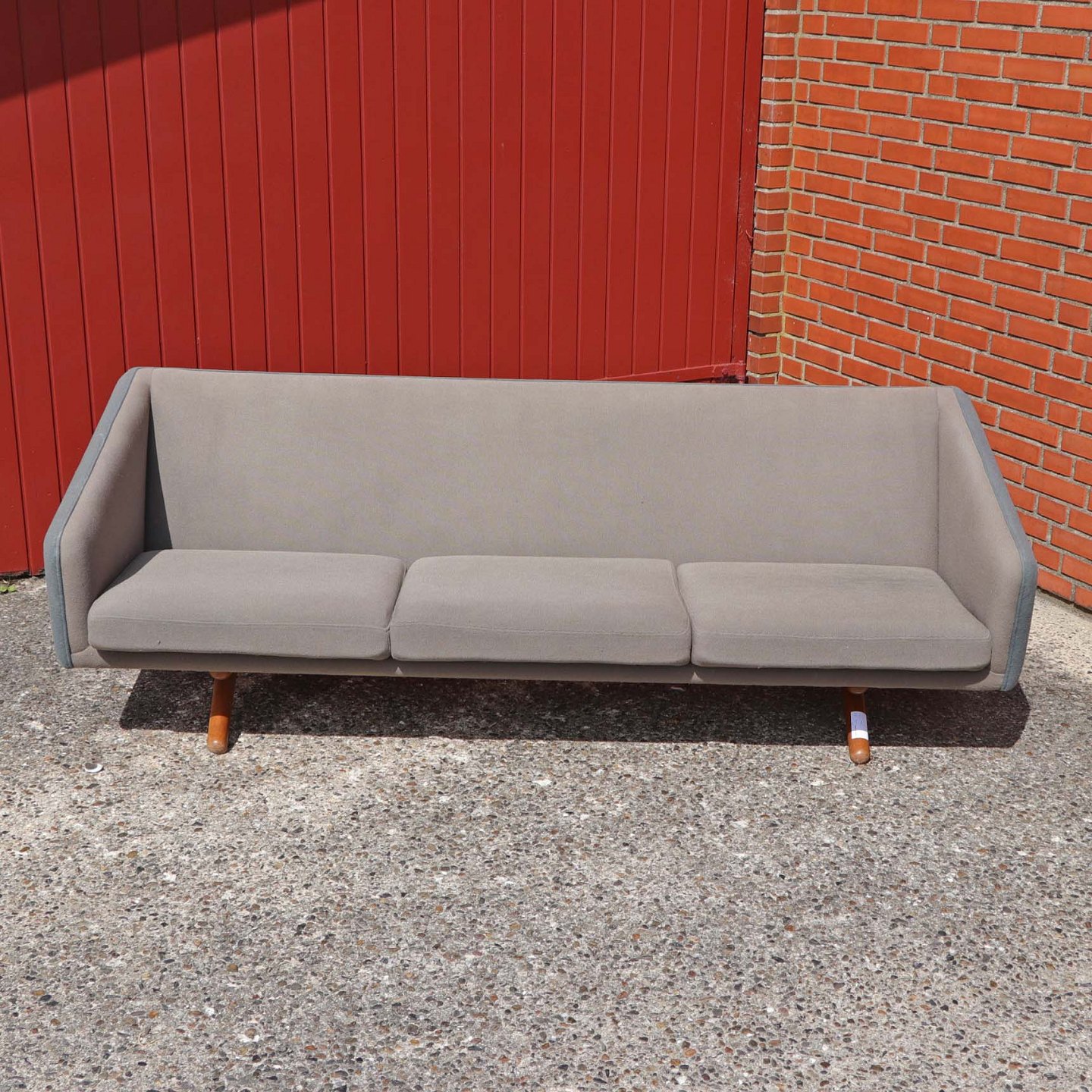 Tre personers sofa model ML90 med stel i lakeret egetræ og betrukket med lys blå og lysegrå uldstof.