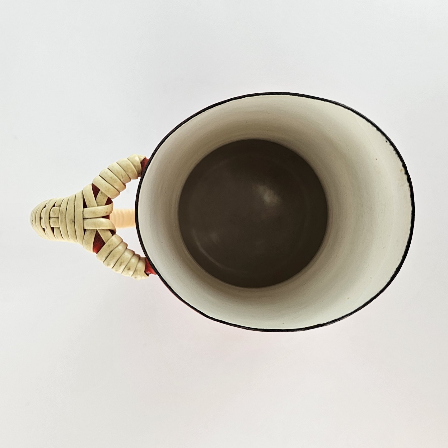 Rød emaljekande med hvid emaljebelægning på indersiden samt hank omviklet af flettet plast