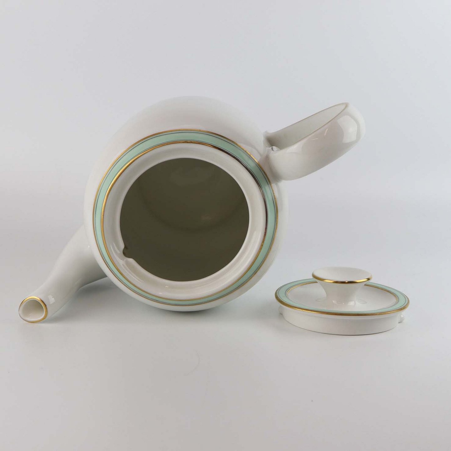 Service i glat hvidt porcelæn med mintblå dekoration og dobbelte guldkanter