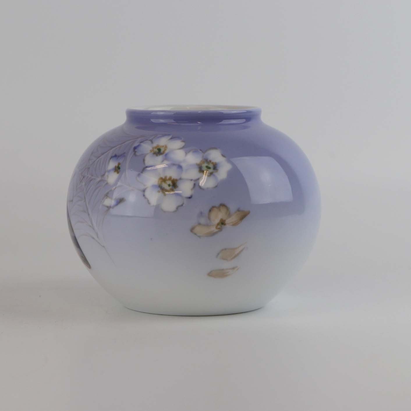 Kongelig kugleformet vase i porcelæn i graduerede blå nuancer med motiv af sommerfugle, edderkoppespind og hvide blomster nr. 814/2390