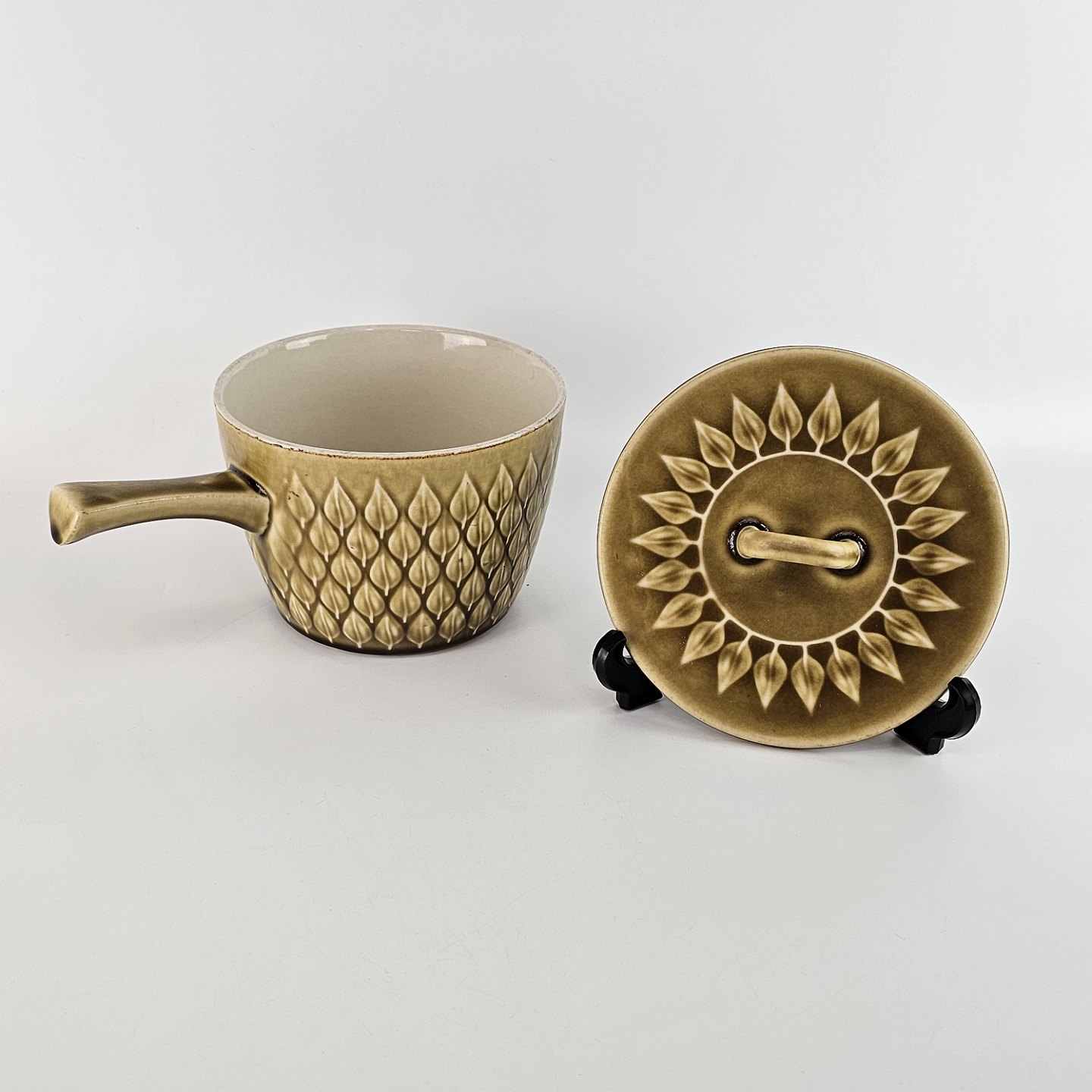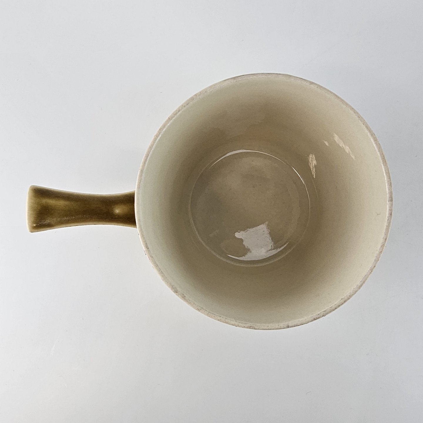 Gult stentøj med mønster af blade. Brugsspor kan forekomme