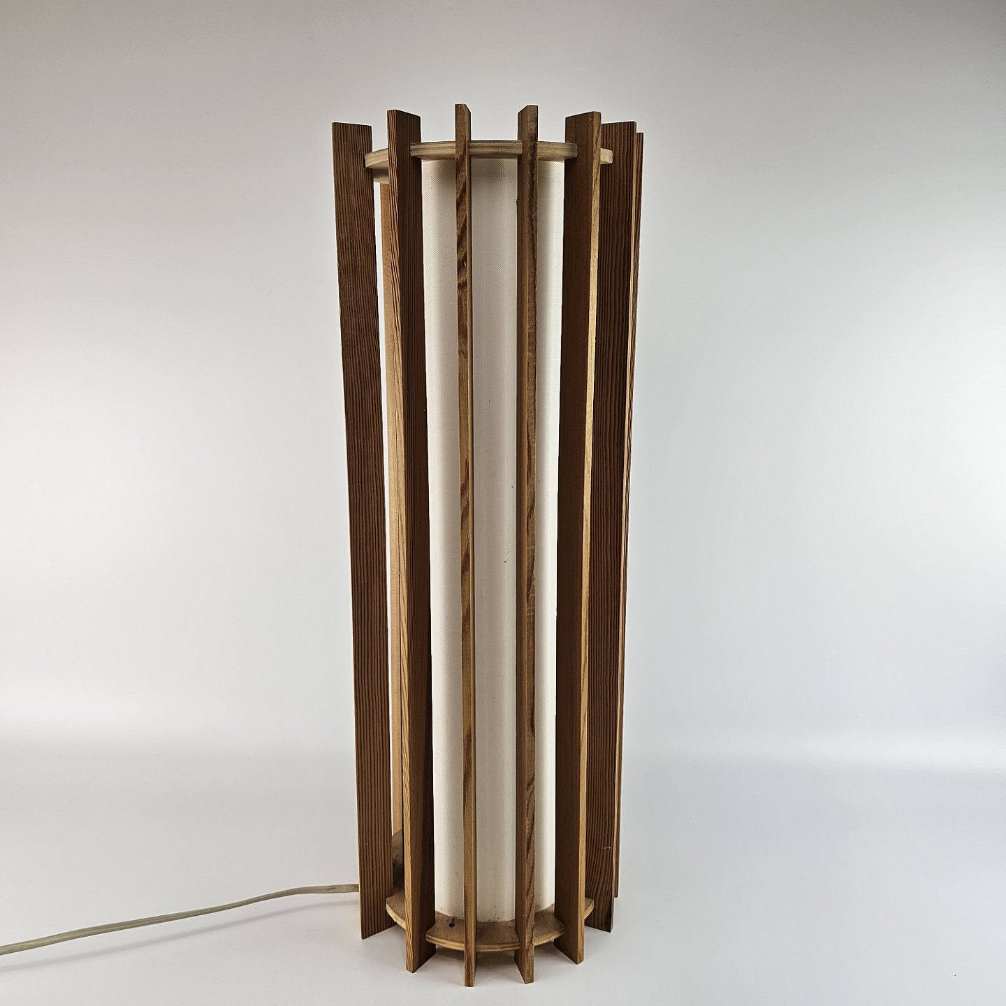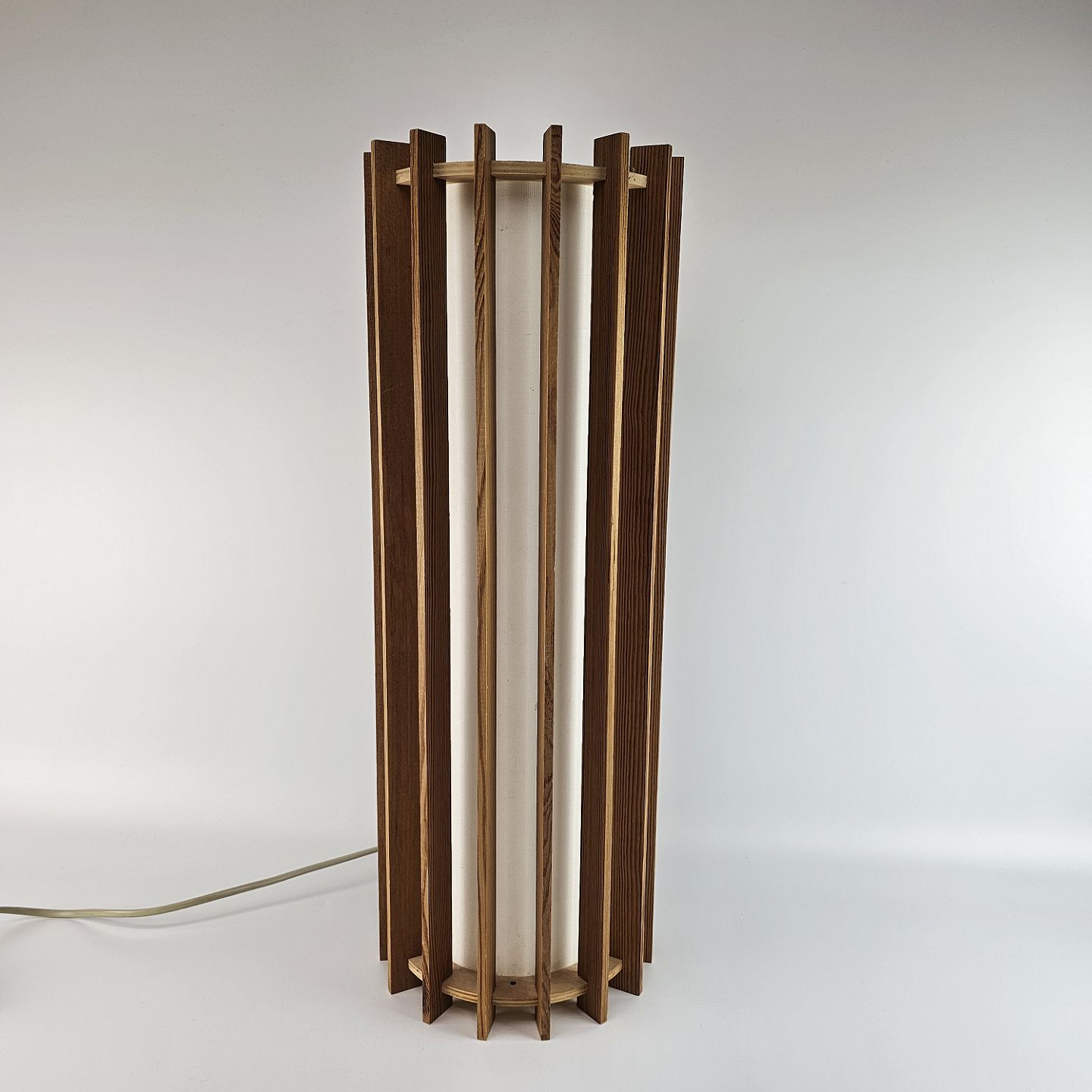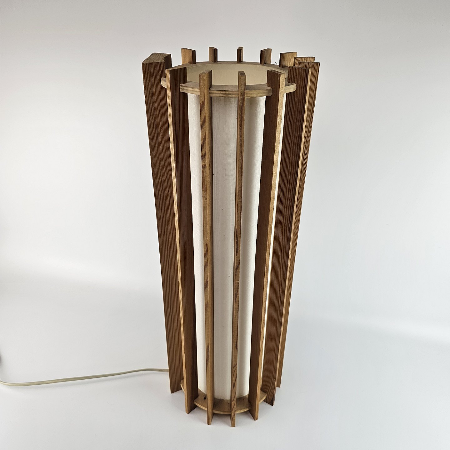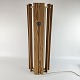 Lampe med lameller af fyrtræ og hvid inderskærm. Hul til vægophæng.