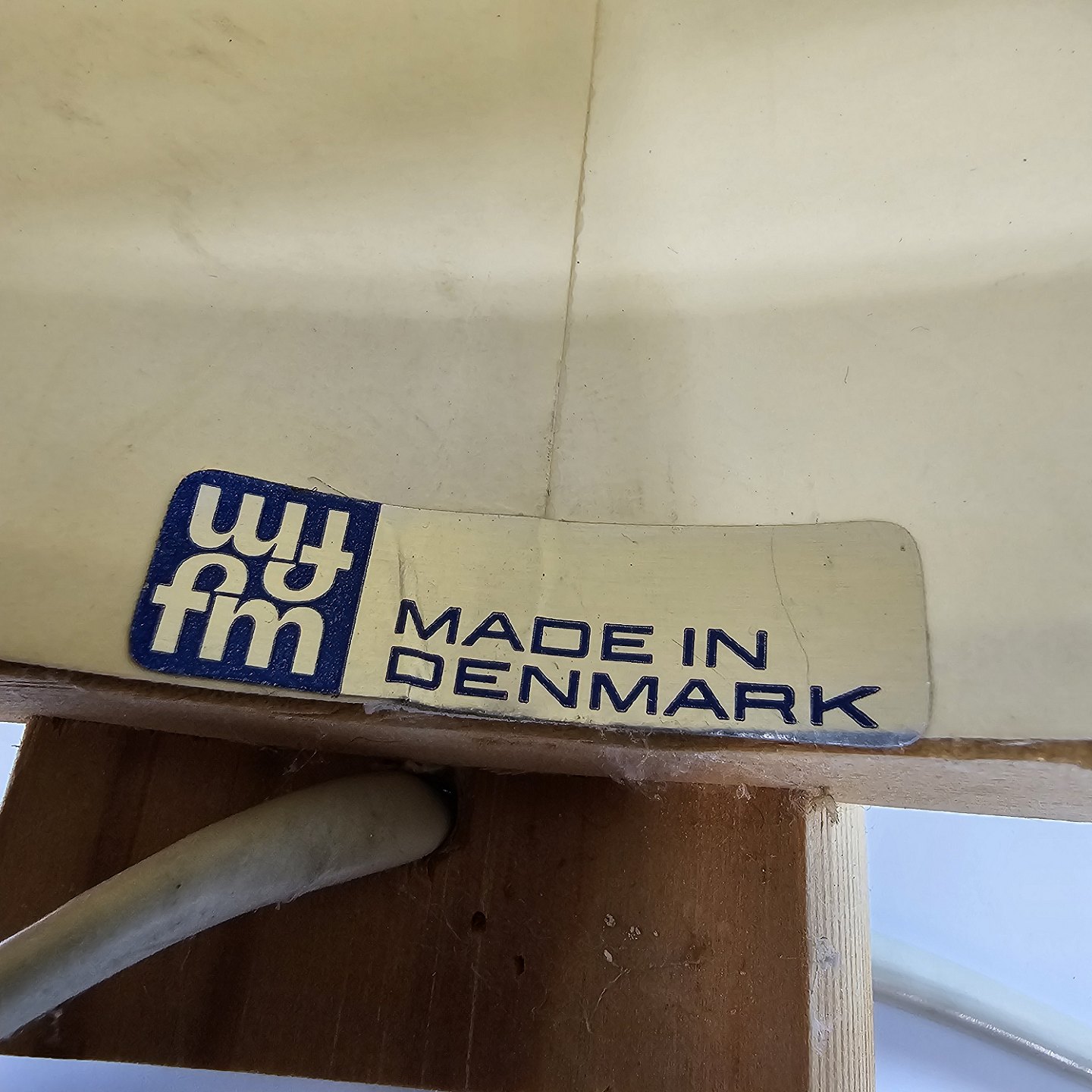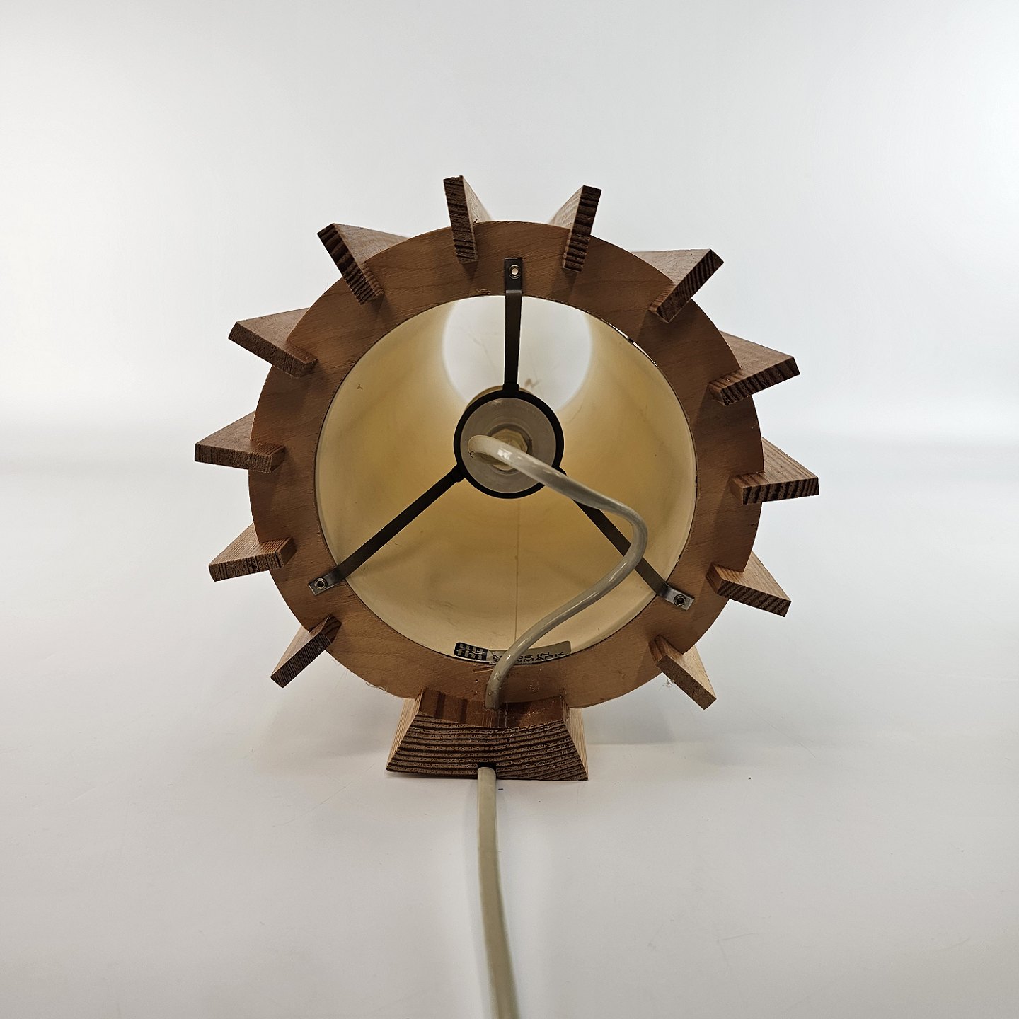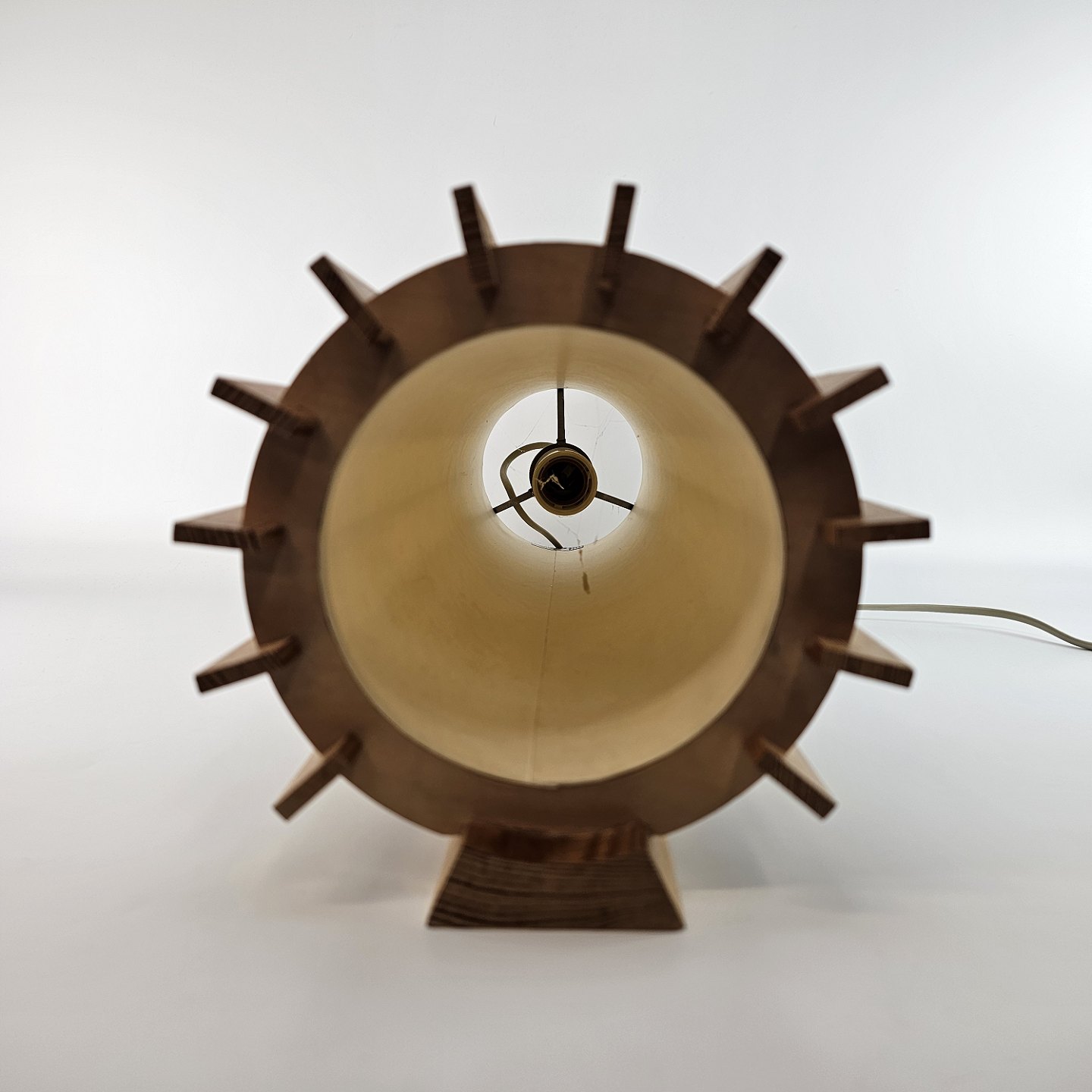 Lampe med lameller af fyrtræ og hvid inderskærm. Hul til vægophæng.