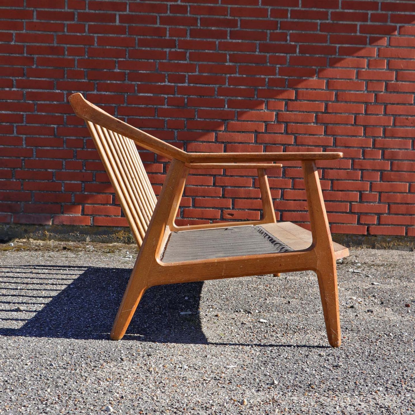 Fremstår med brugsspor som vandmærker, slid på lak og mindre hul i stof ved bunden.