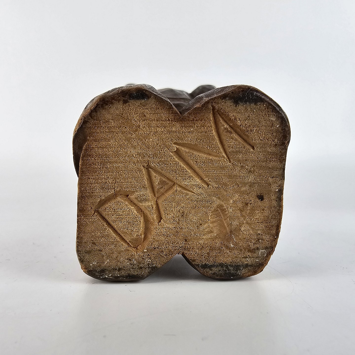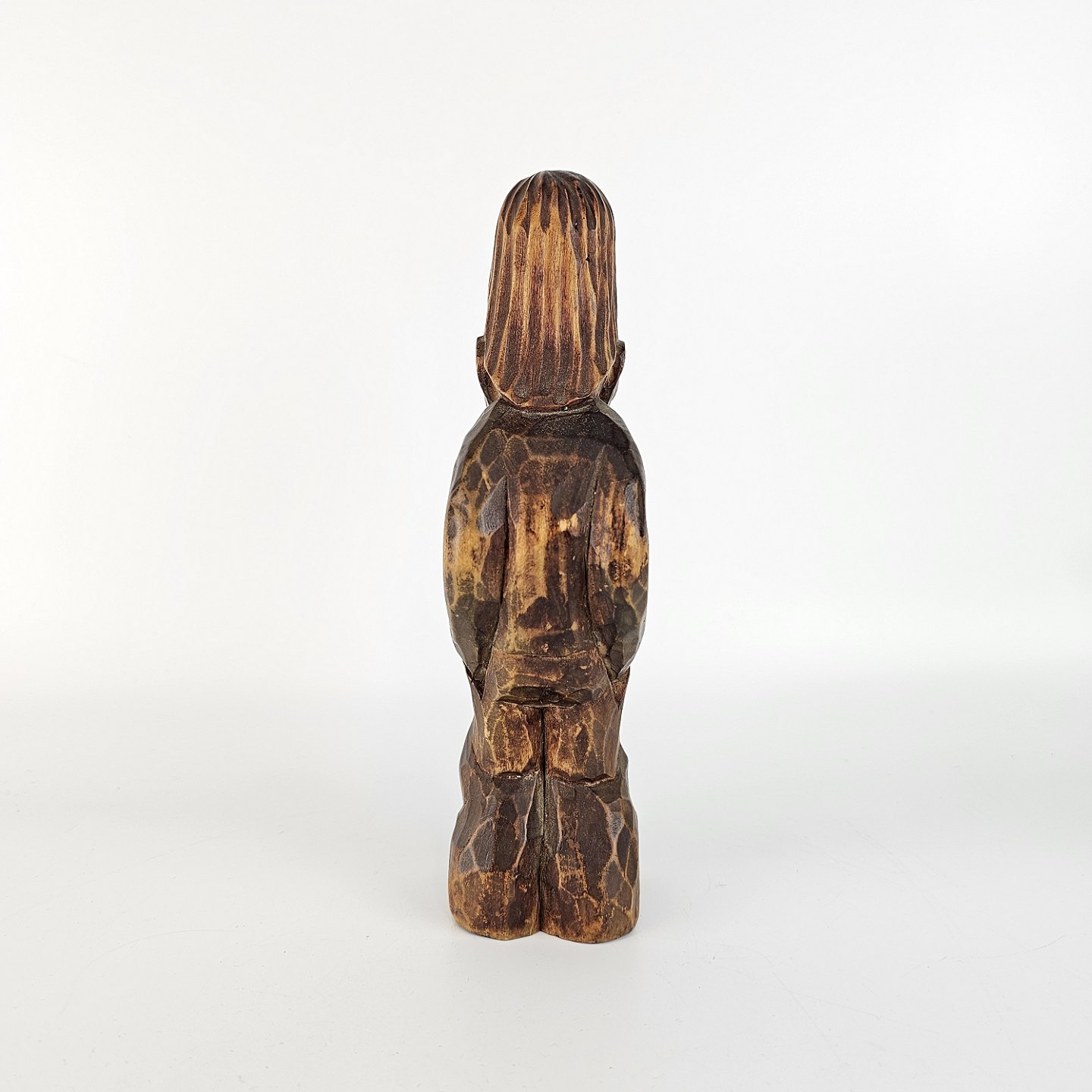Håndsnittet træfigur udformet som en mand med krum ryg og hænderne i lommerne