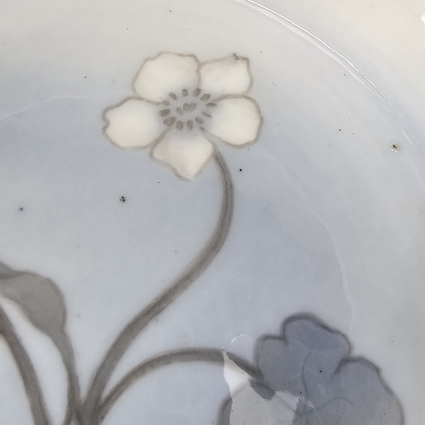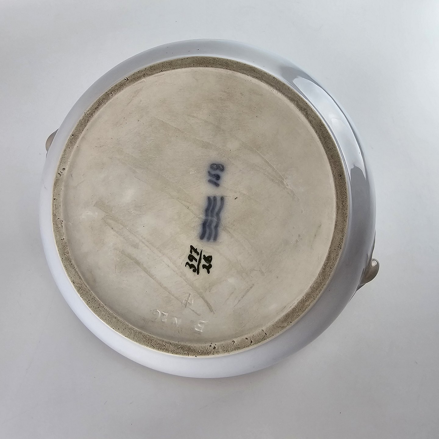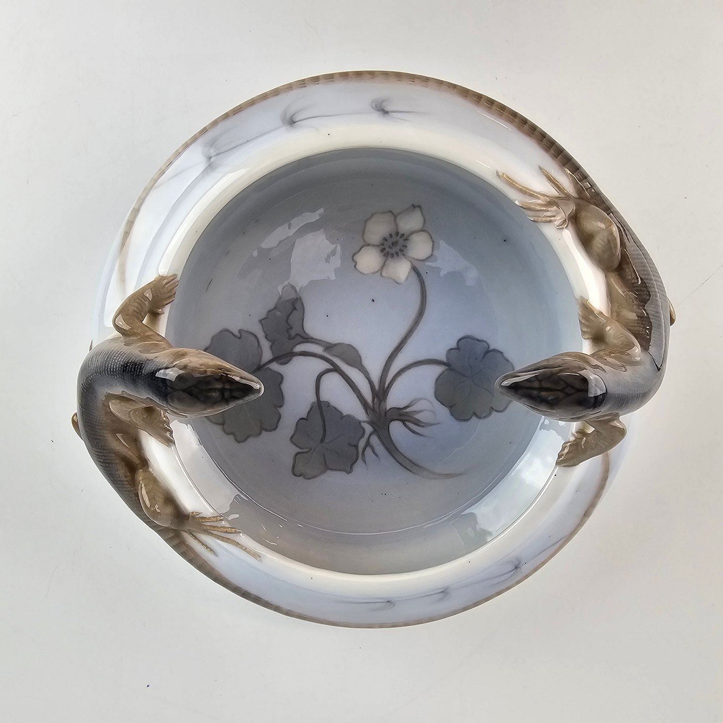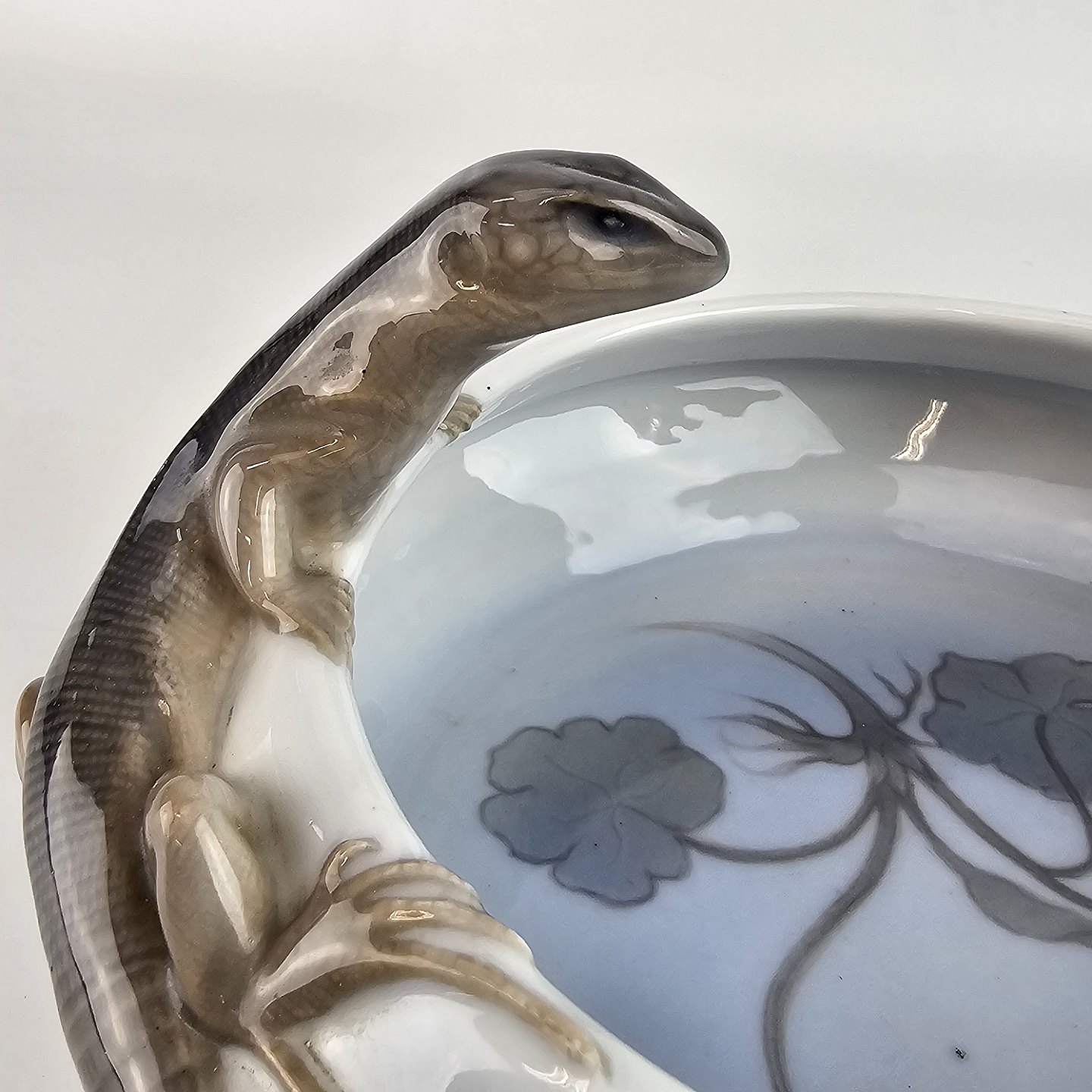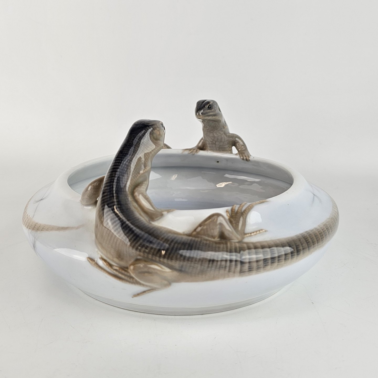 Skål af porcelæn med høje kanter, dekoreret med 2 firben hvis haler ligger langs kanten. Nede i skålen er der malet en blomst. Nr. 397/26