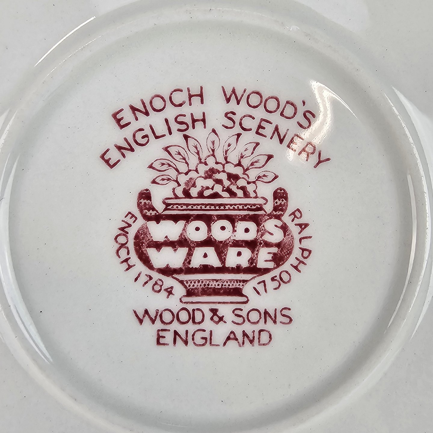 Rød Paris er af engelsk fajance dekoreret med forskellige landskaber og blomster i kanten, alt i forskellige røde nuancer. Brugsspor kan forekomme.