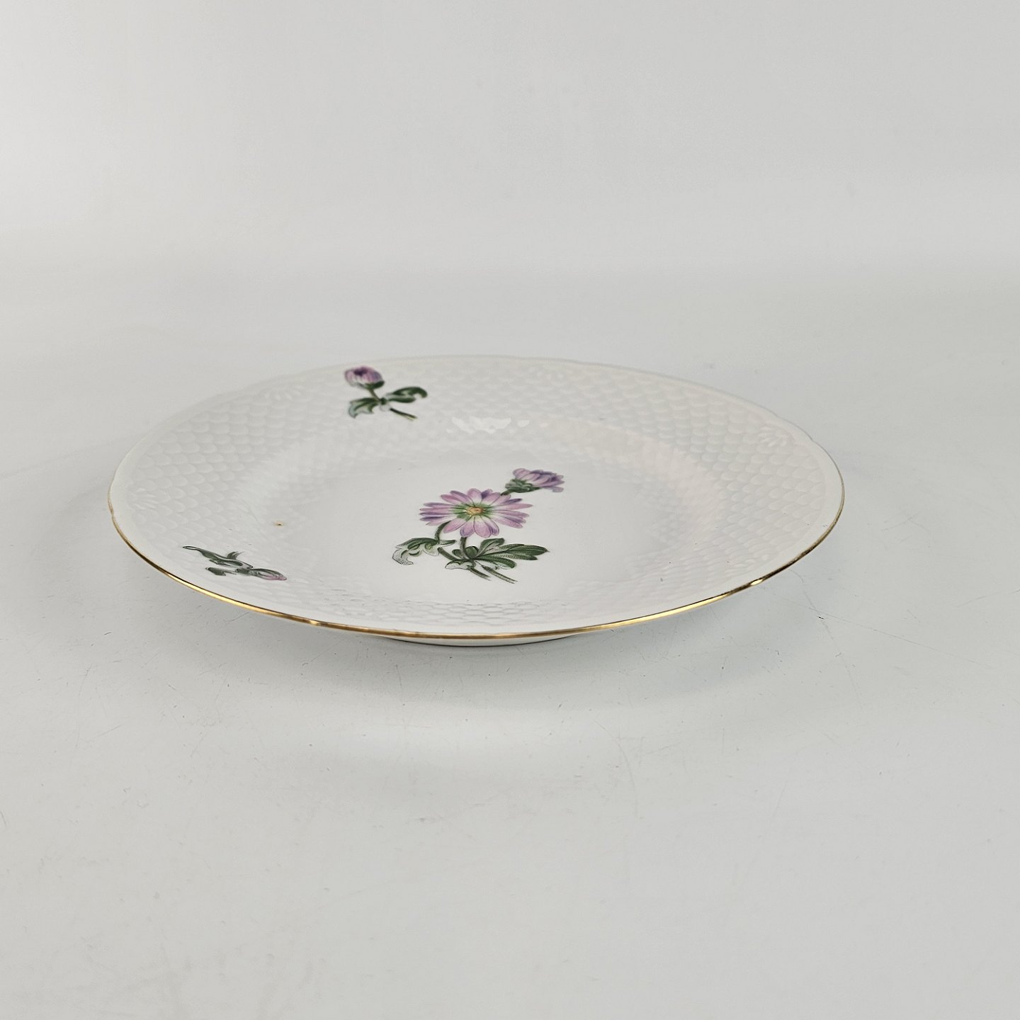 Stellet Krysantemum er af hvidt porcelæn, dekoreret med lys lilla blomst, grønne blade og guldfarvet streger