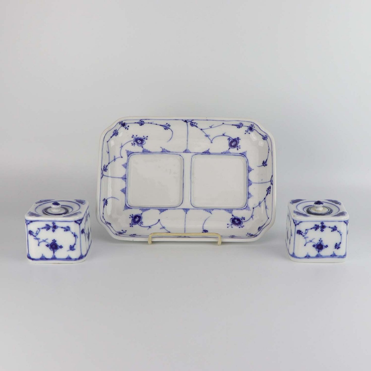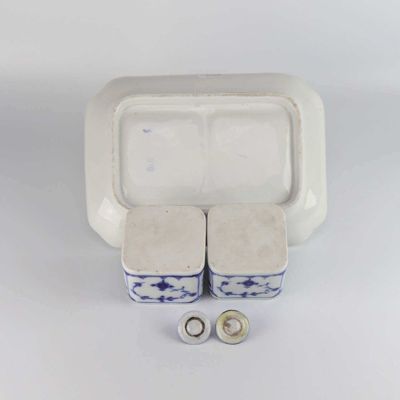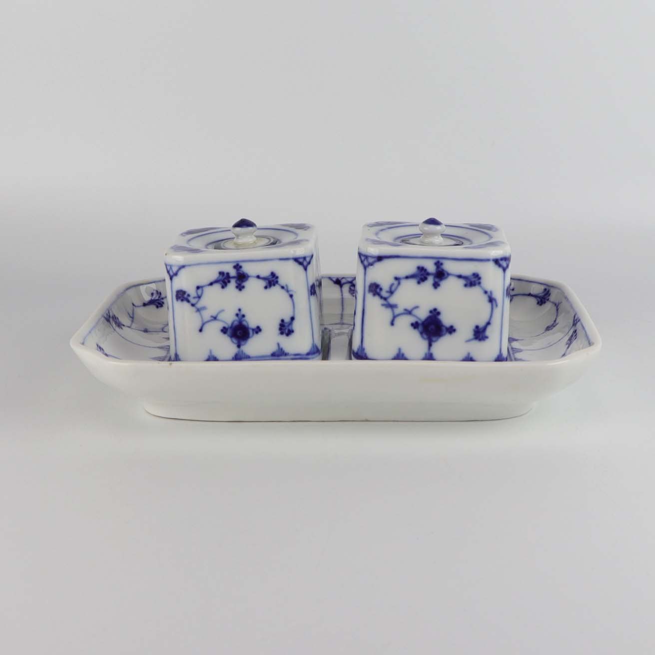 Antik skrivesæt bestående af to blækholdere med låg samt tilhørende fad. Sættet er i glat hvid porcelæn med blåmalet motiv. Ifølge stemplet er dette sæt fremstillet i perioden 1853 - 1895