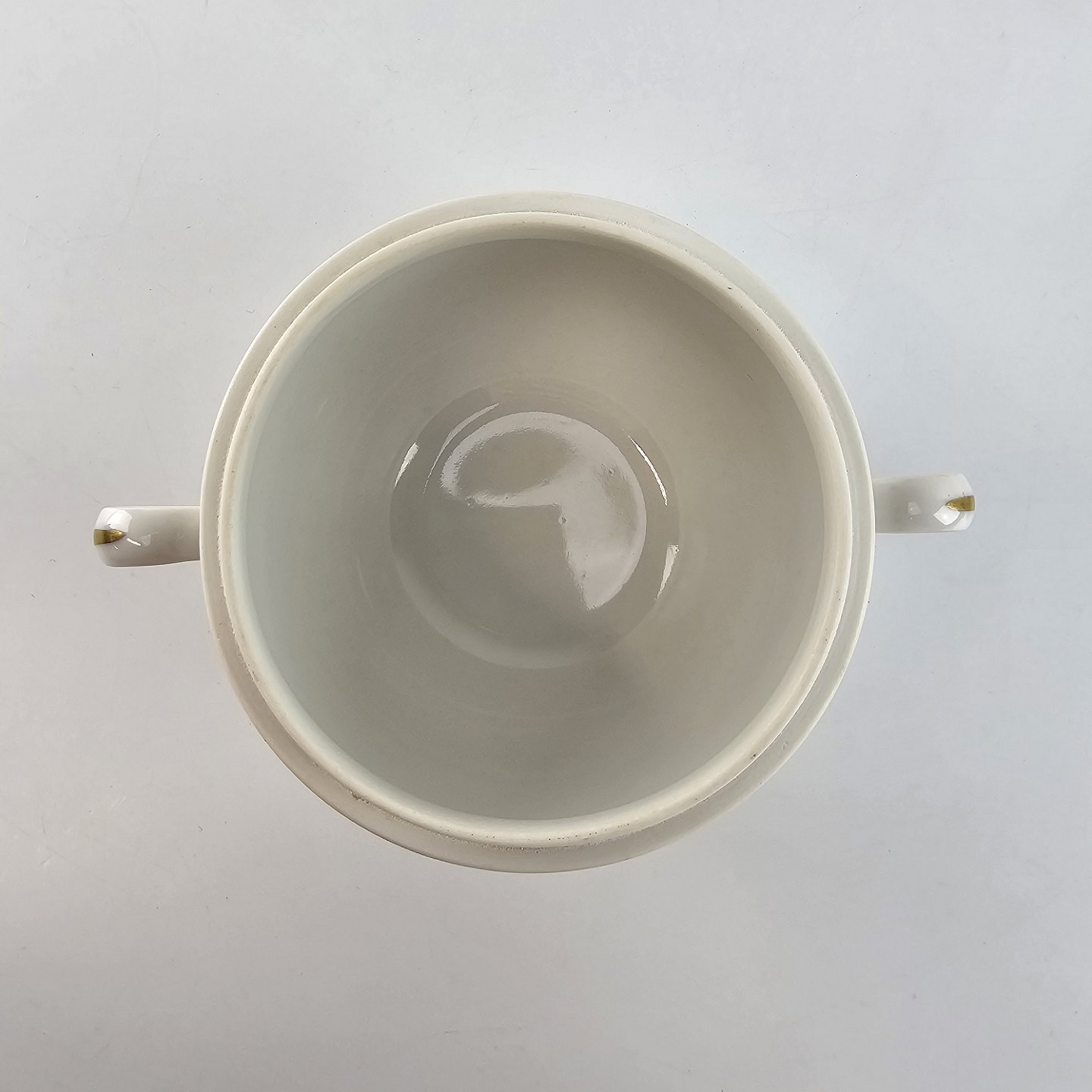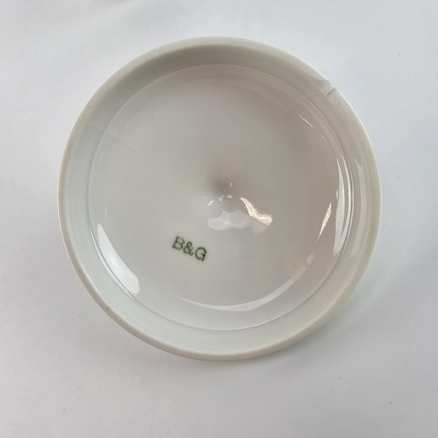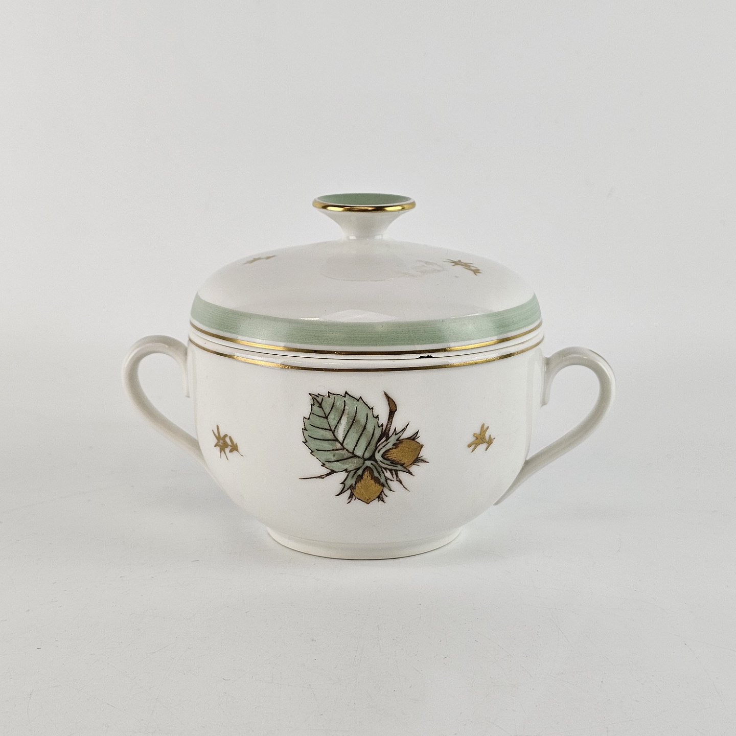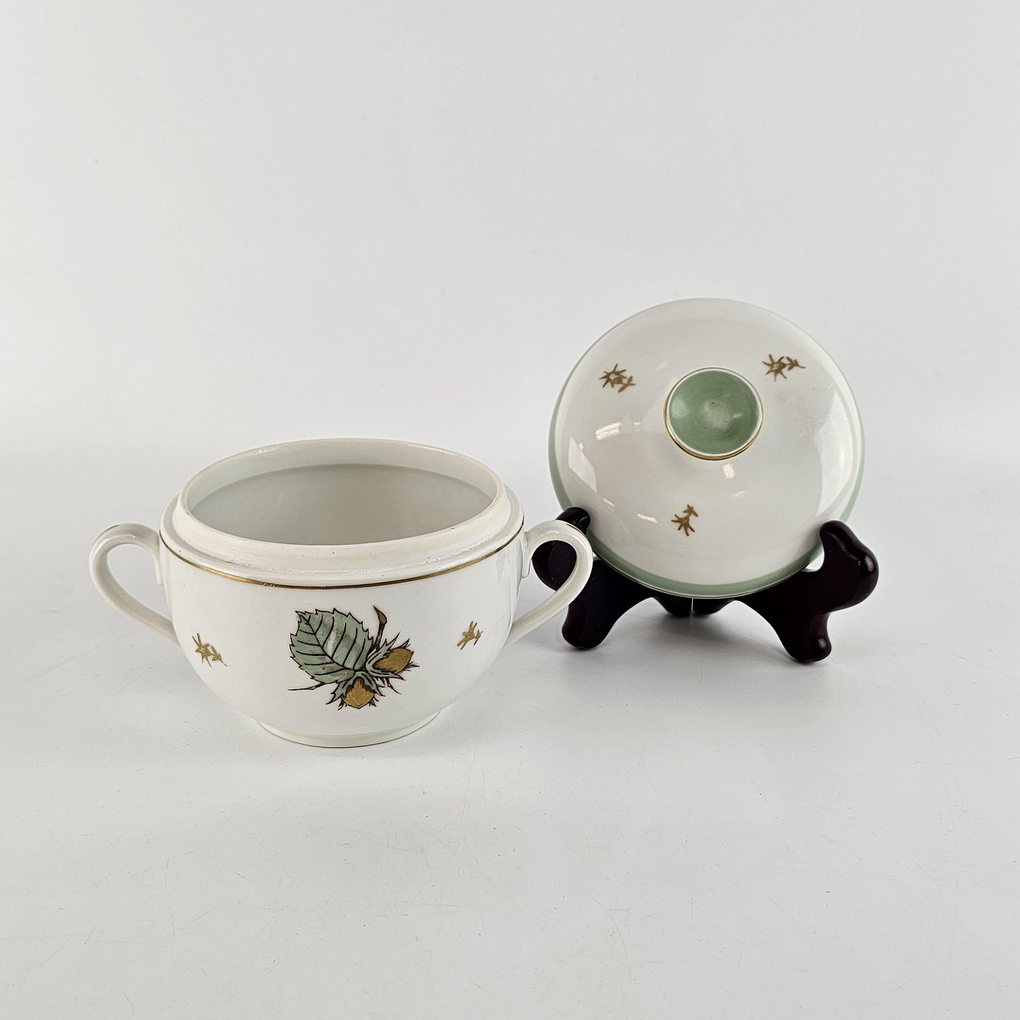 Hasselnød er hvidt porcelæn dekoreret med guldfarvet nødder, grønne blade samt et lys grønt bånd og guldkant. Brugsspor kan forekomme.