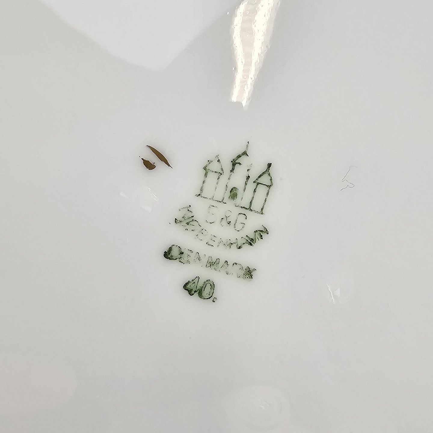 Hasselnød er hvidt porcelæn dekoreret med guldfarvet nødder, grønne blade samt et lys grønt bånd og guldkant. Brugsspor kan forekomme