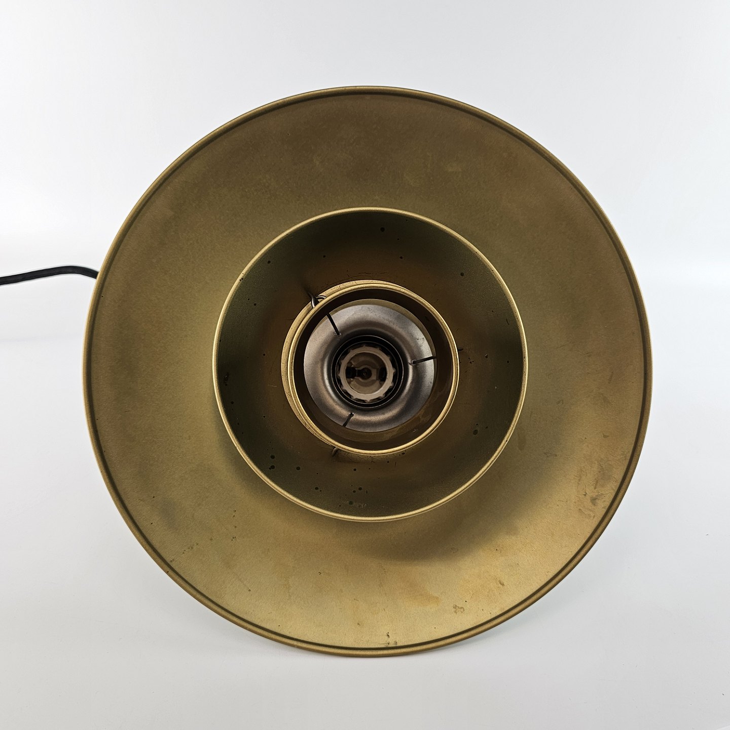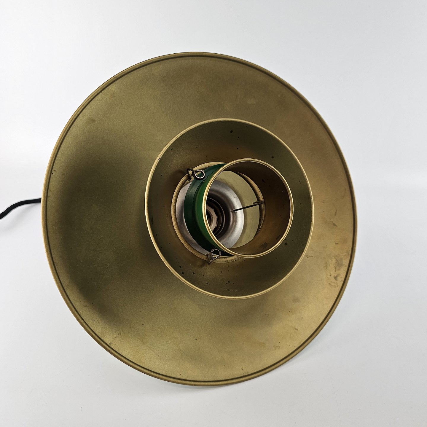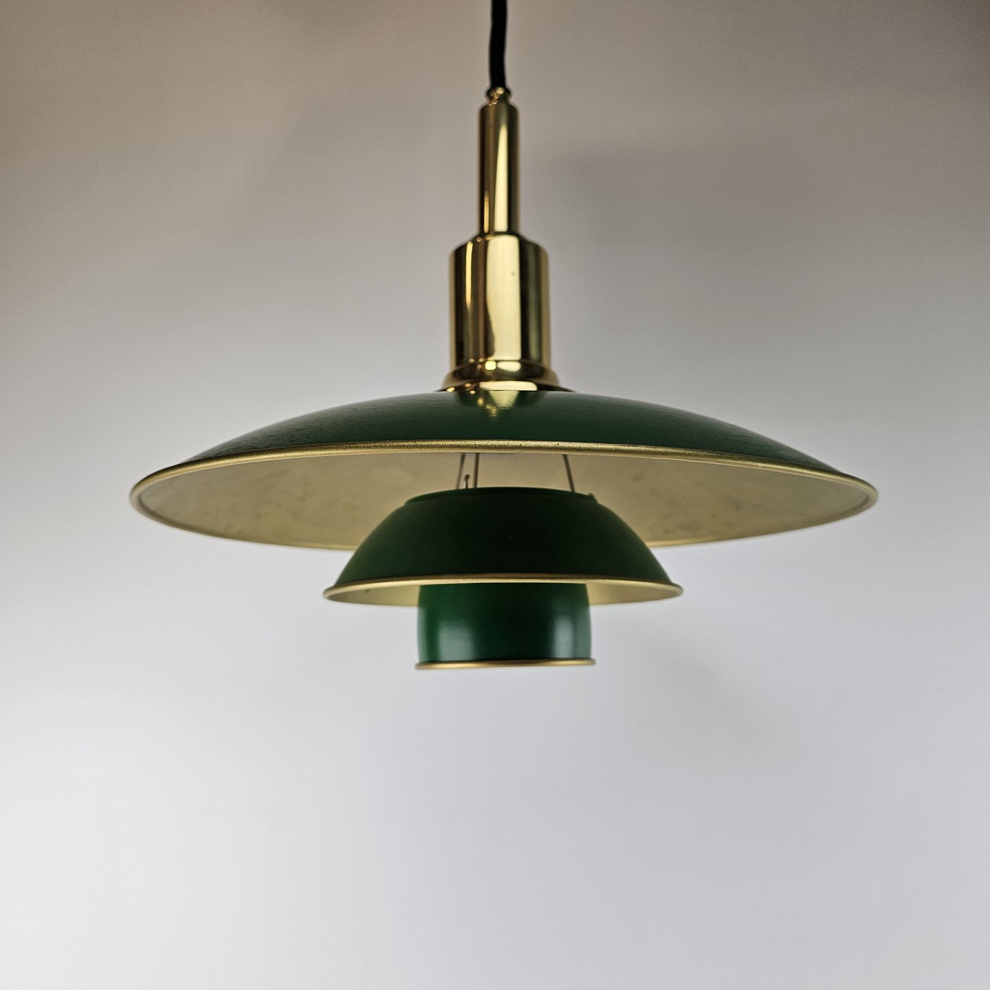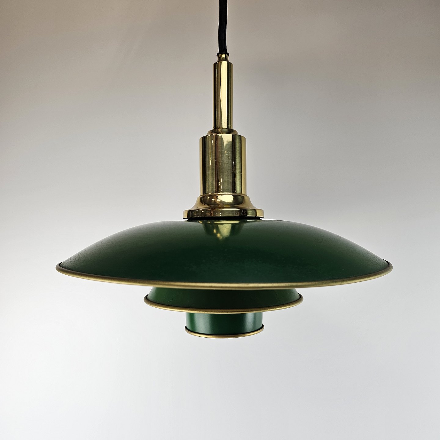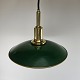 Loftlampe i messing med skærme lakeret grøn. Jubilæumspendel. Stofledning i sort, mindre brugsspor indvendigt