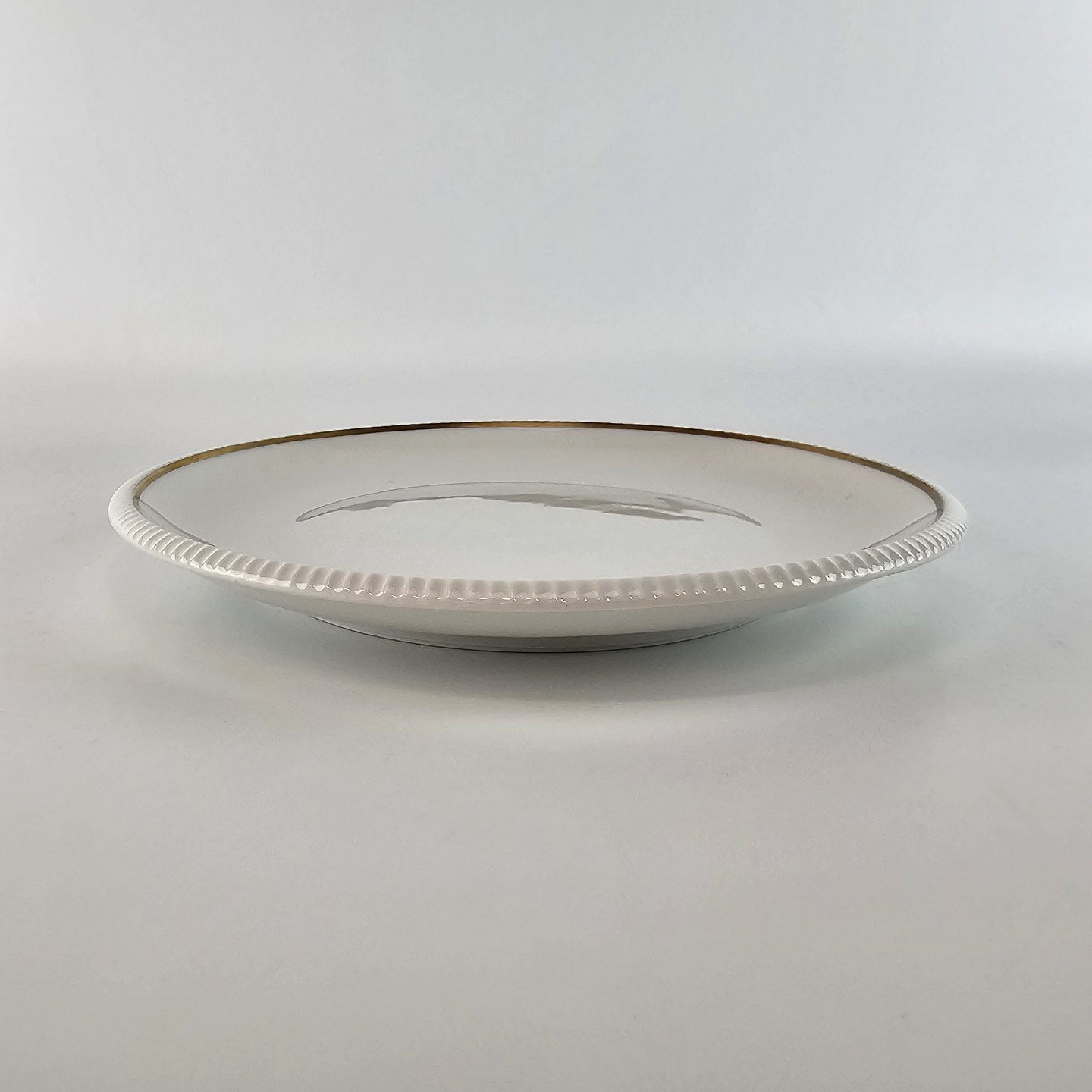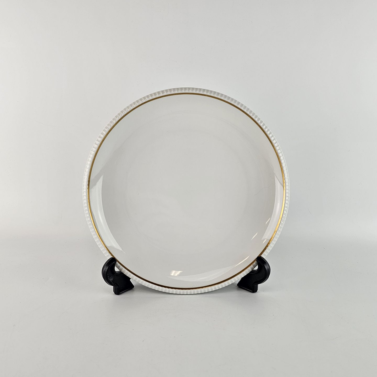 Vega er hvidt porcelæn med guldkant. Tallerkener og fade er dekoreret med riller i kanten. Kan fremstår med brugsspor