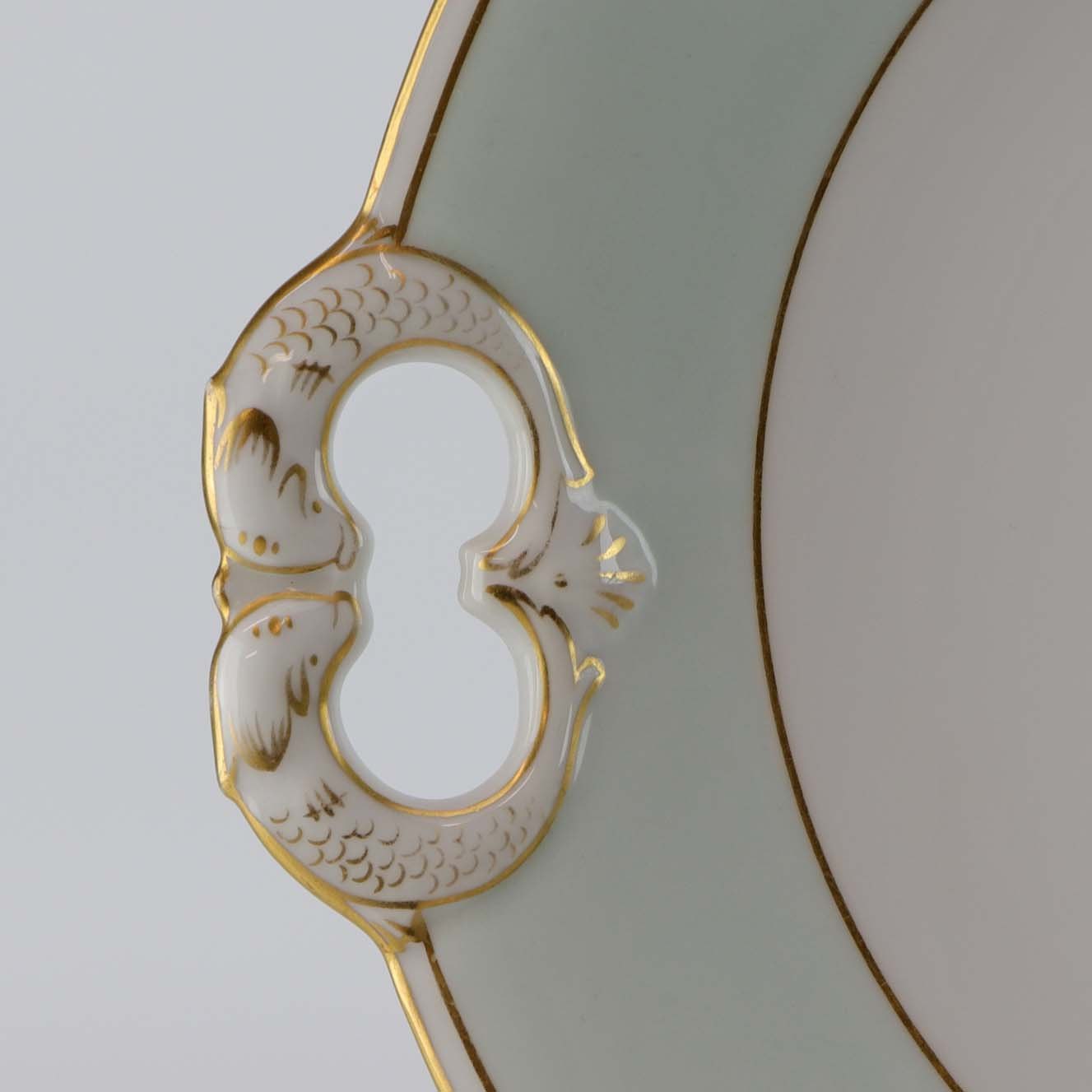 Strauss er af hvidt glaseret porcelæn med et bredt bånd i mintblå, samt enkelte guldlinjer. Lettere brugsspor kan forekomme