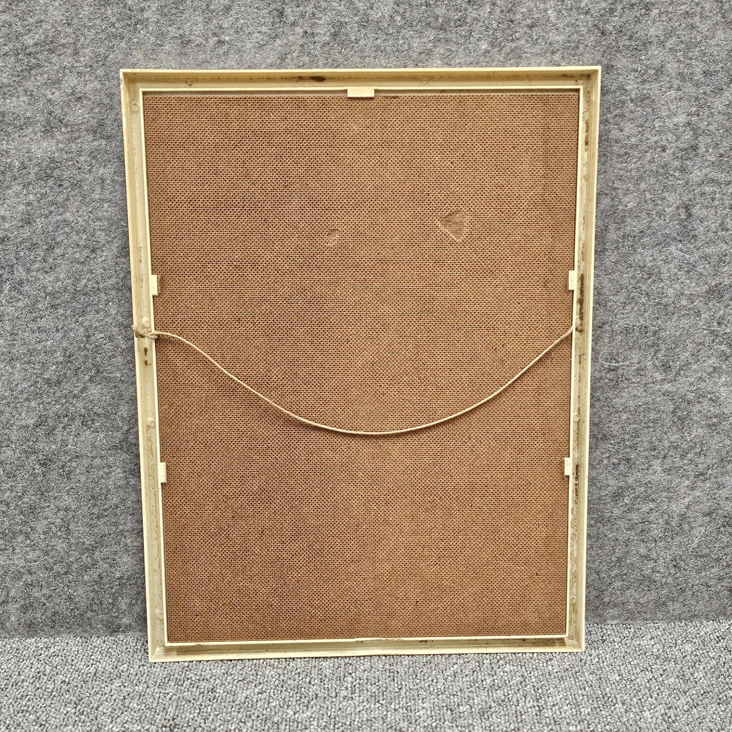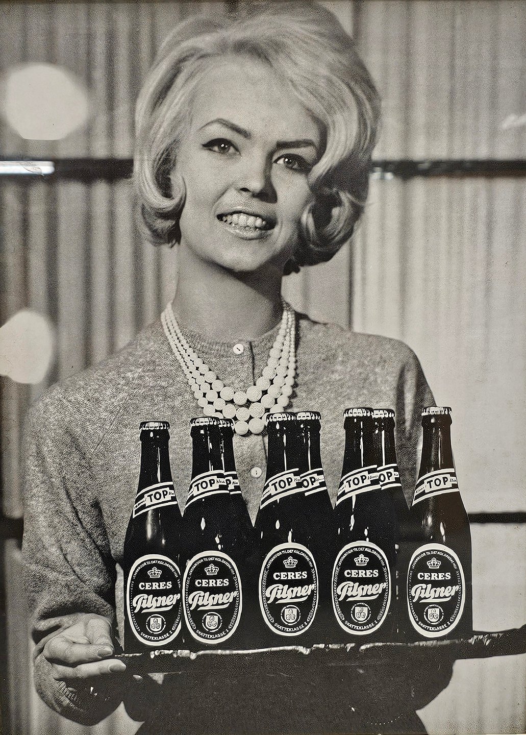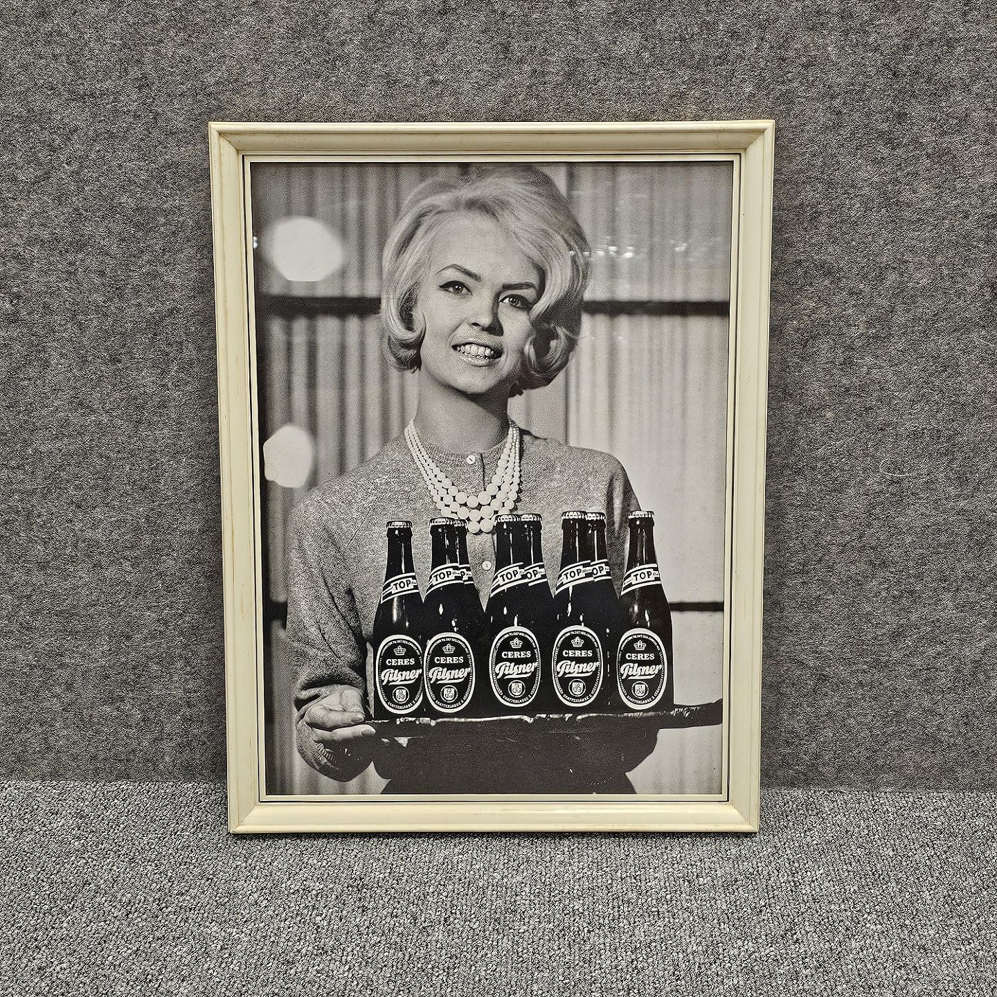 Indrammet reklame tryk i lys plast ramme med motiv af af kvinde med en bakke med Ceres øl.