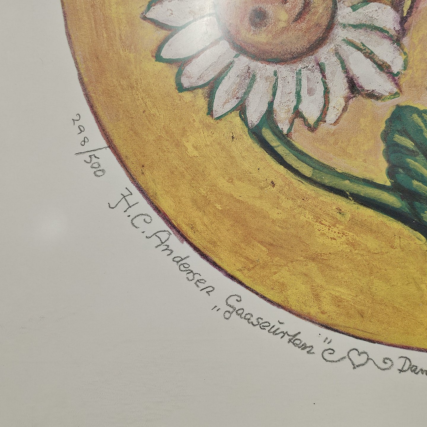 Indrammet litografi i træramme. Motivet er fra H.C Andersens fortælling om Gåseurten og er fremstillet i samarbejde med Danmarks naturfonden i 1983. Nummer 298 ud af 500 eksemplarer.
