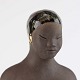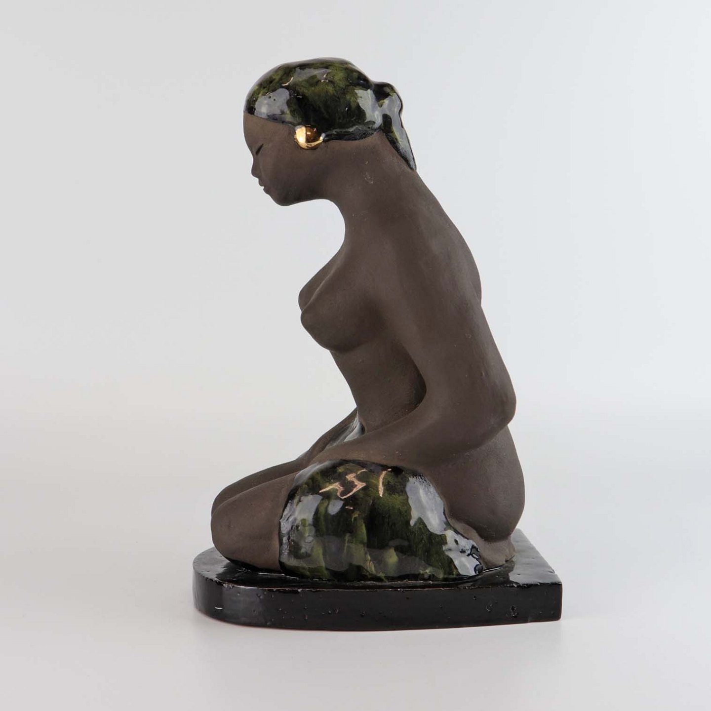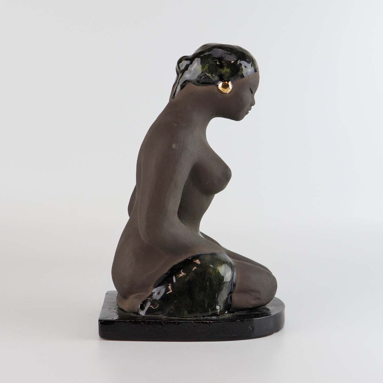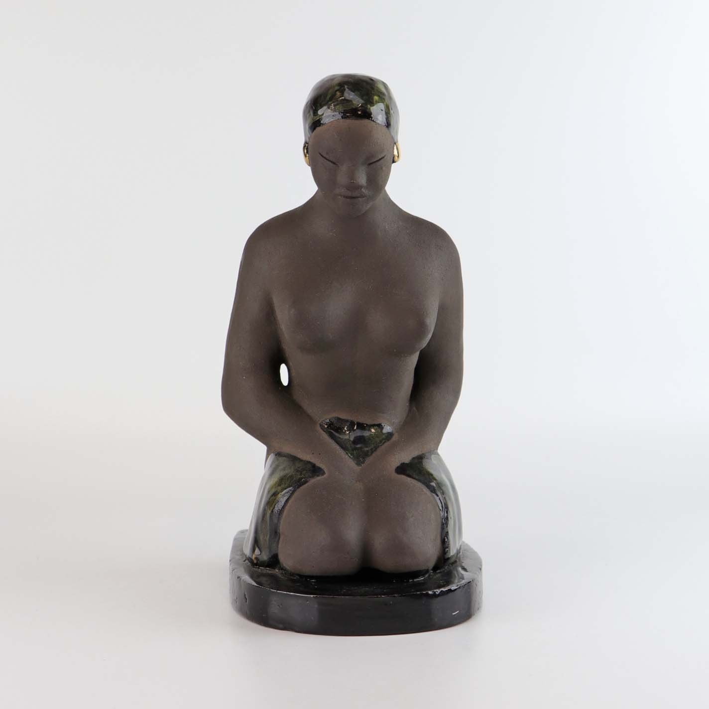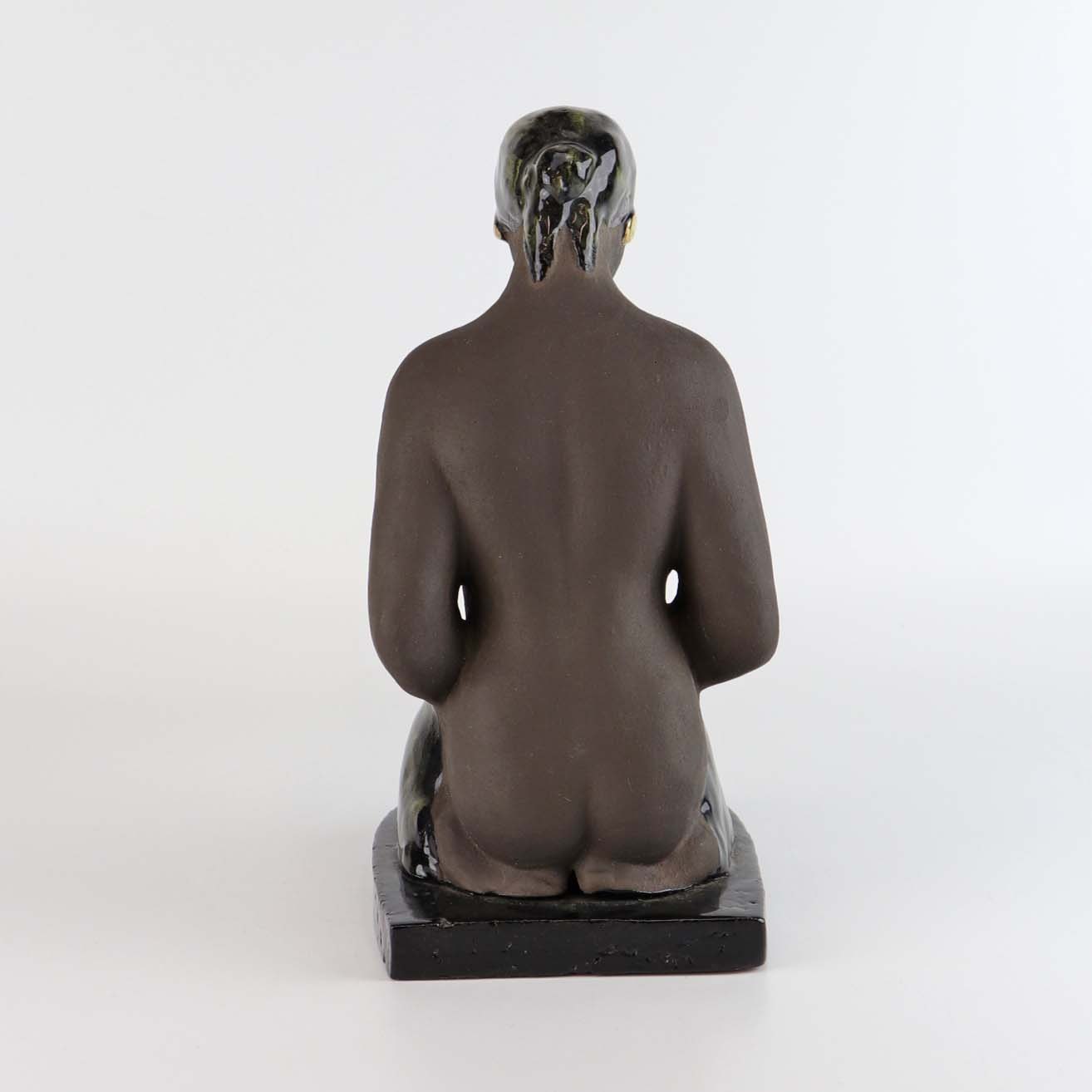 Figur i keramik som er delvist glaseret. Motivet er en nøgen siddende kvinde fra Bali med et klæde over skødet og iført hovedtørklæde med guldøreringe.