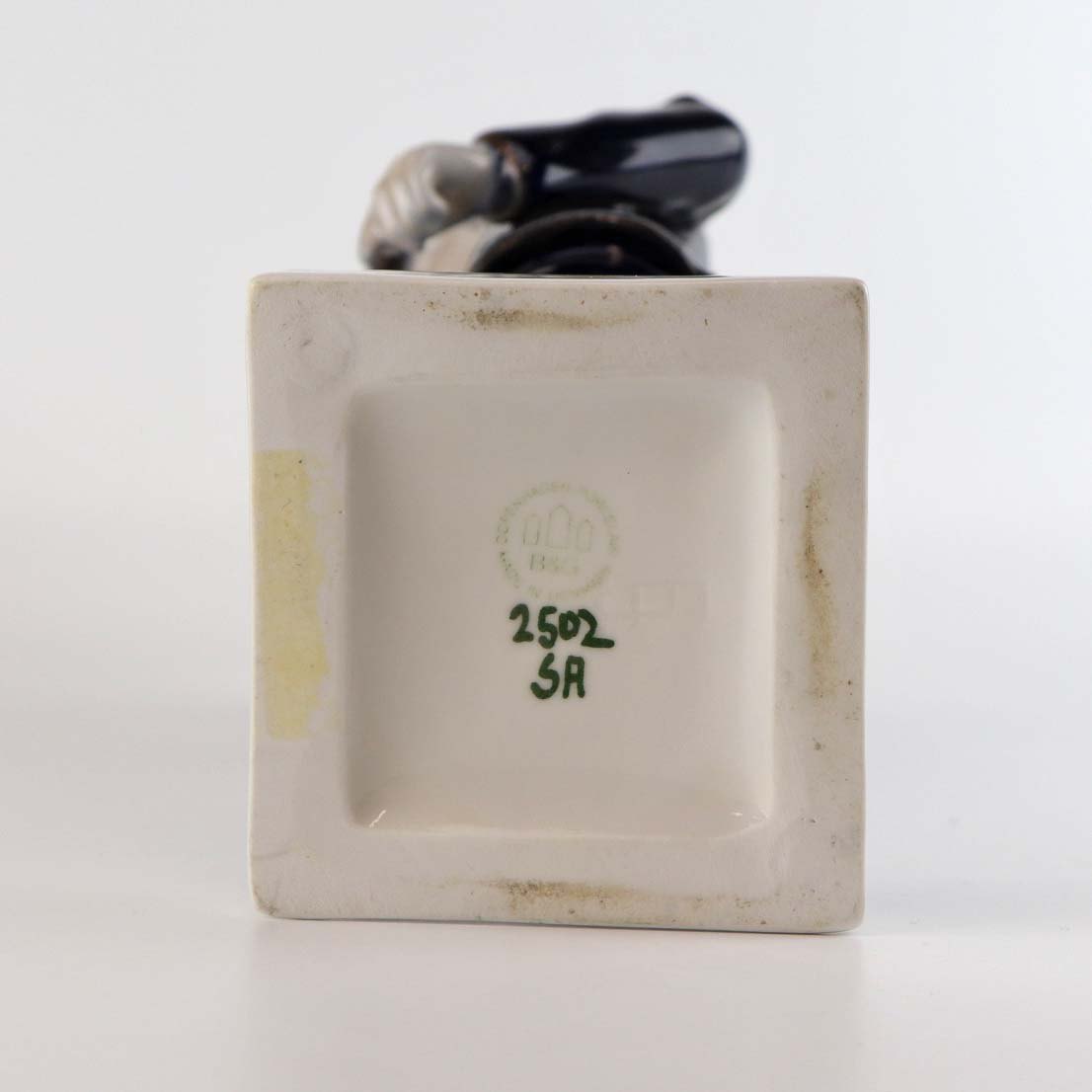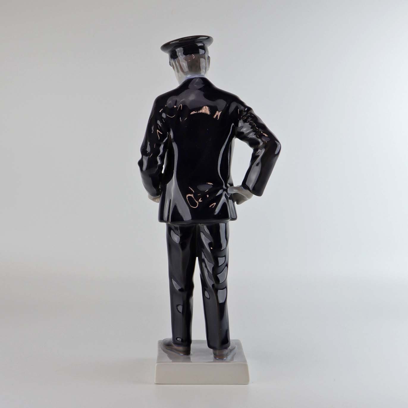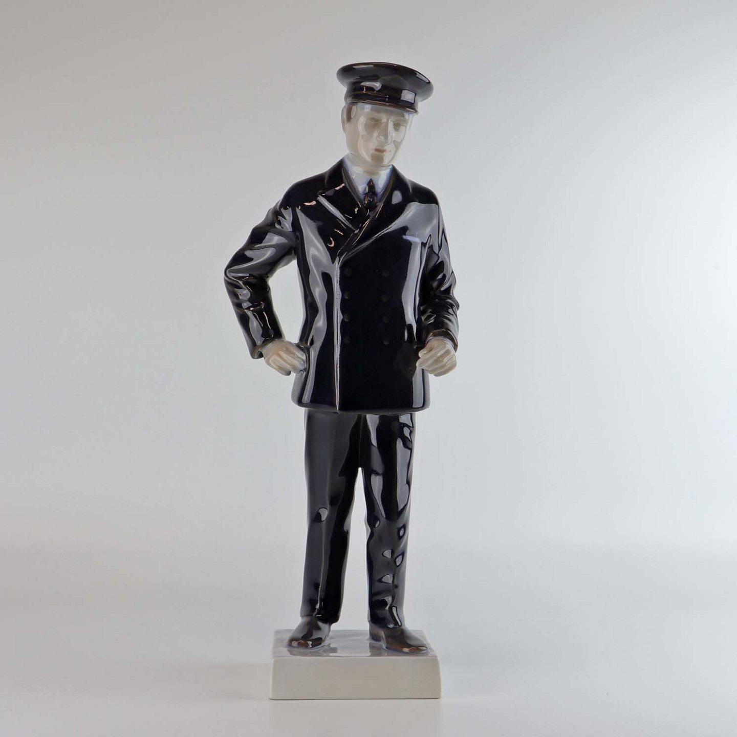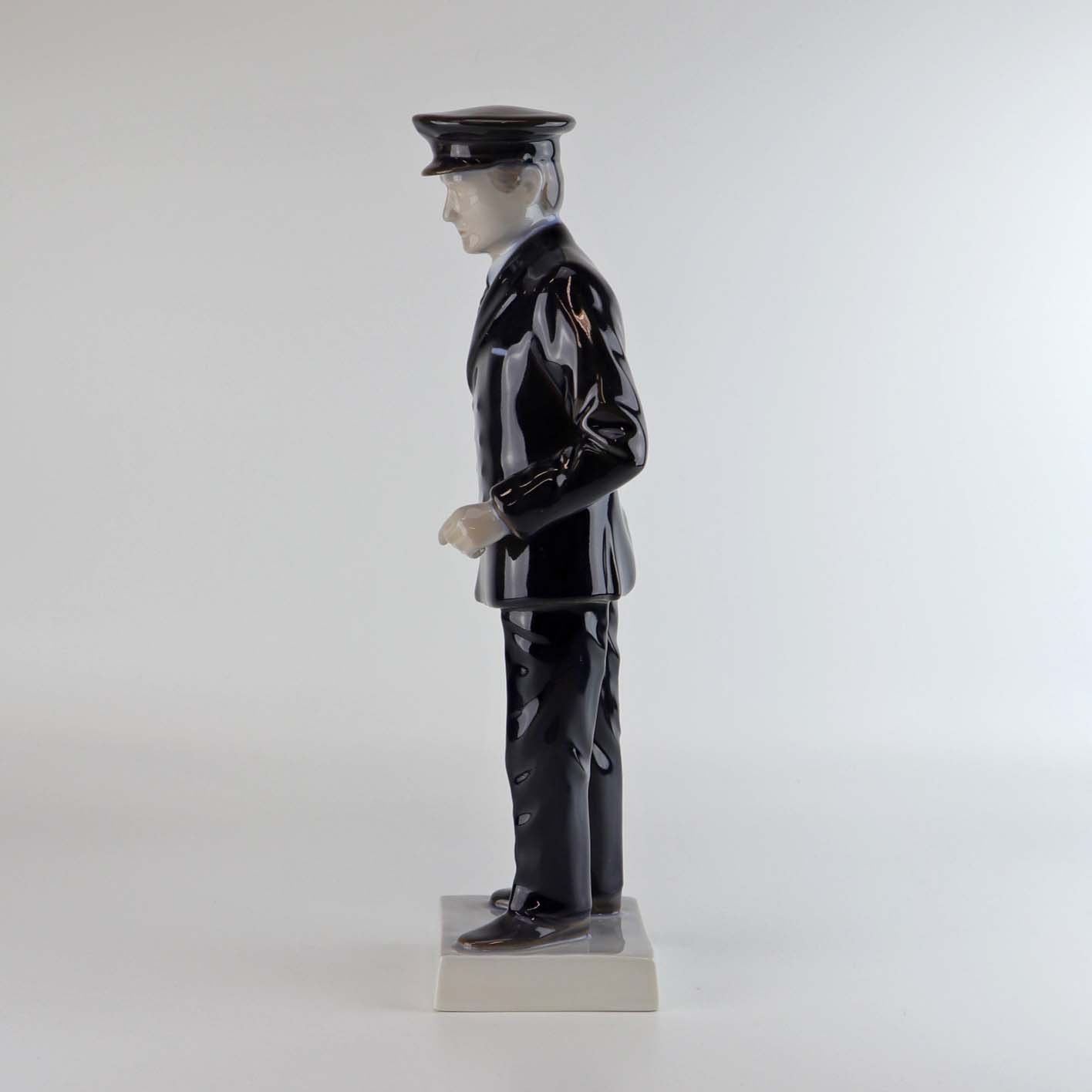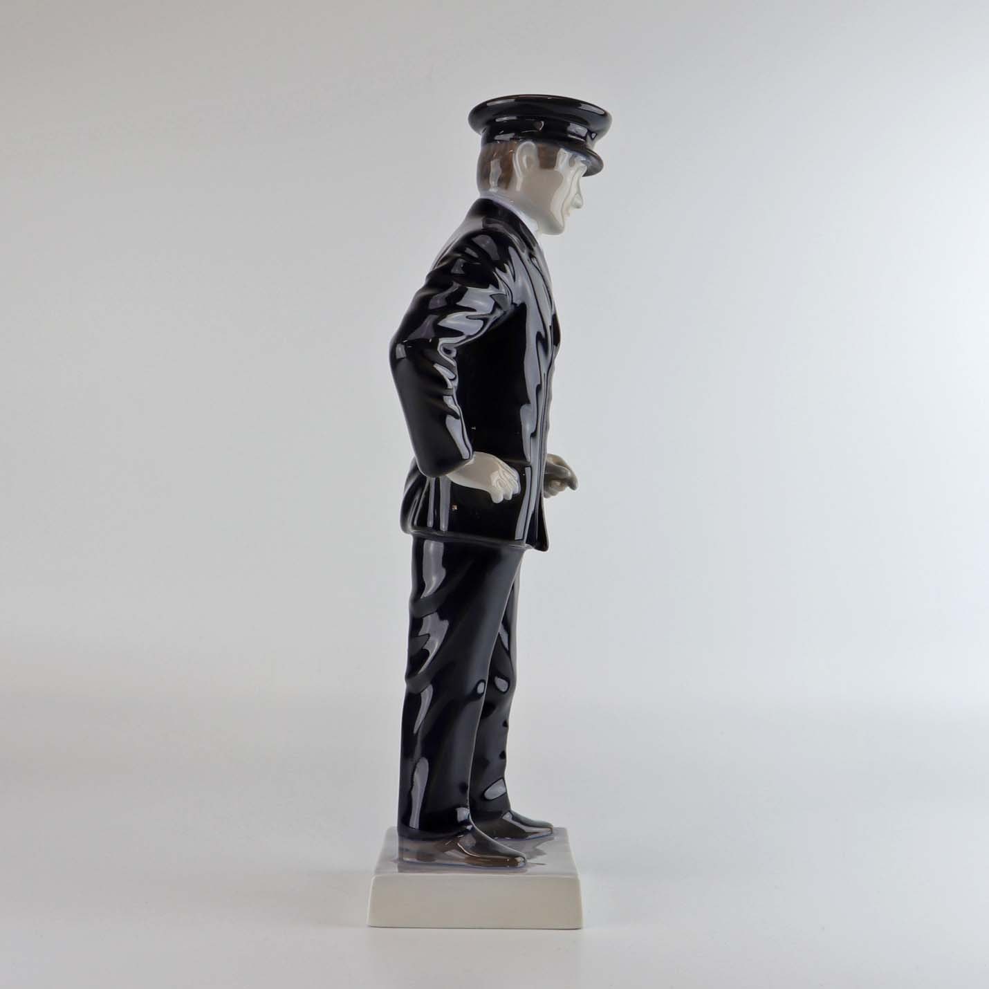 Figur i porcelæn udformet som en mand i mørkeblå uniform med kasket. Nr. 2502