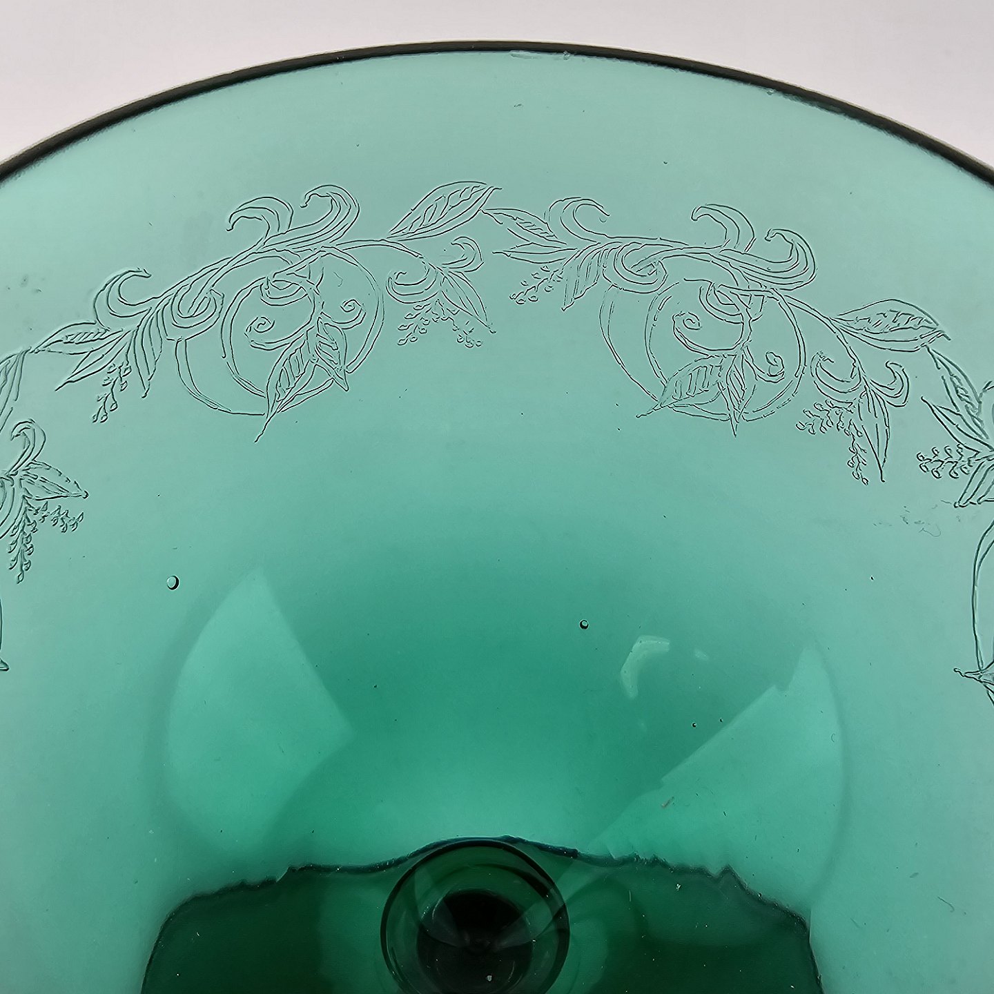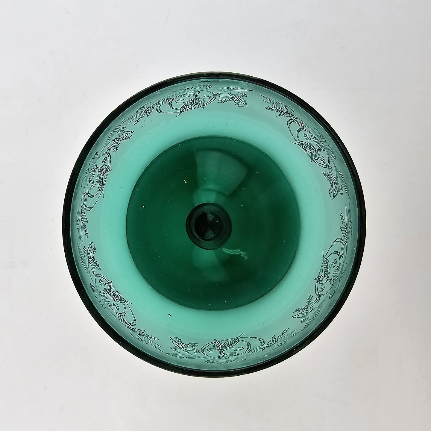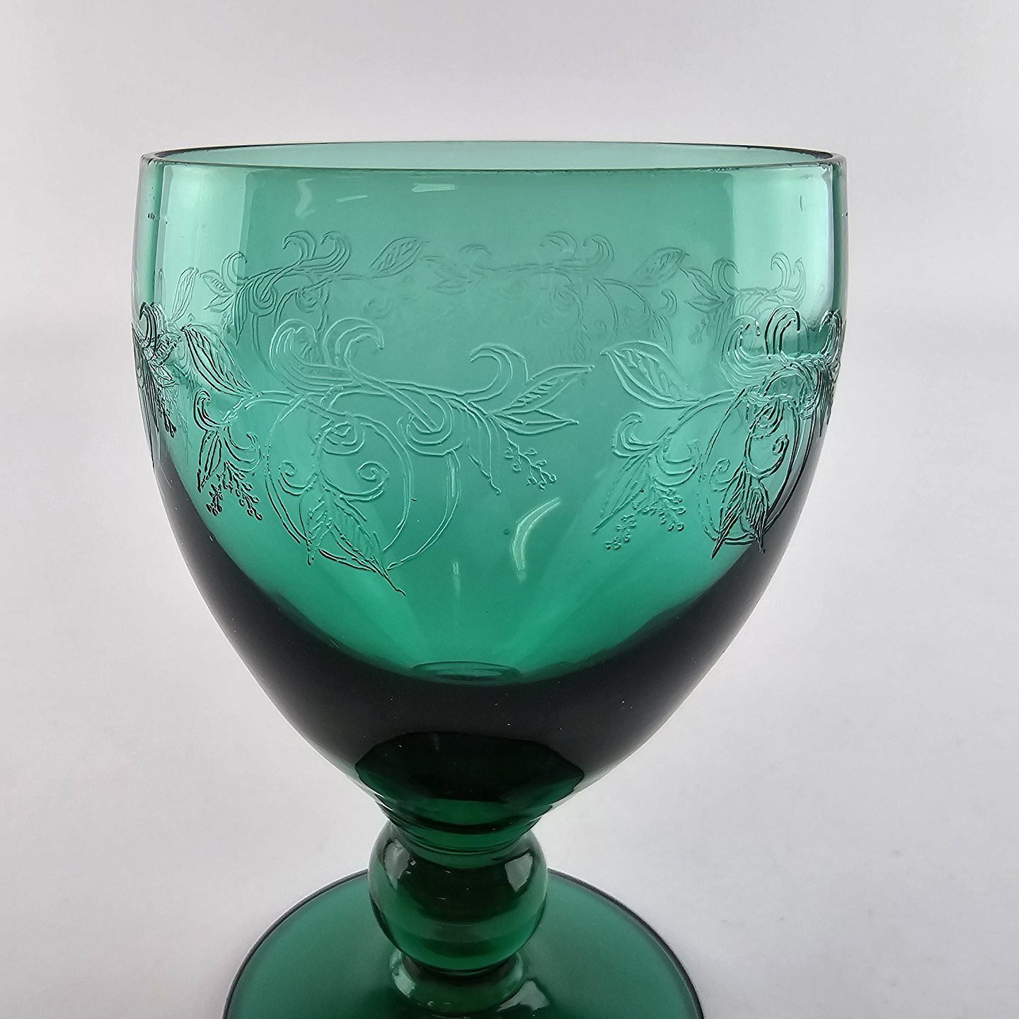 Hvidvinsglas af mundblæst grønt glas, dekoreret med ætsning nr. 5, fra serien Gerda. Produceret fra 1938 til 1950'erne