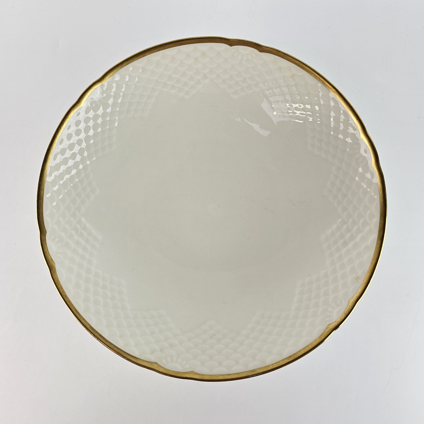 Åkjær er cremefarvet porcelæn med guldkant og mønster som ligner skæl. Lettere brugsspor kan forekomme