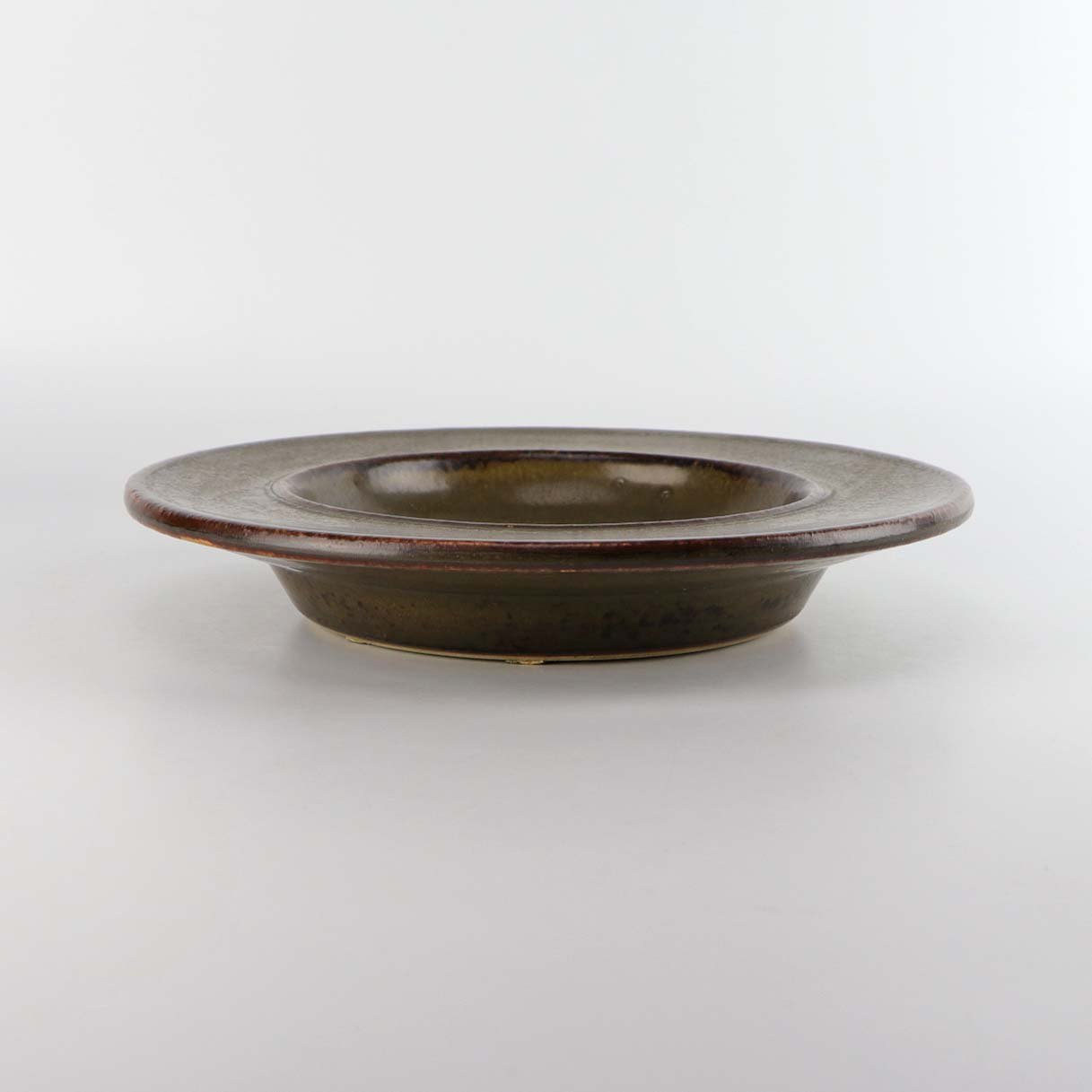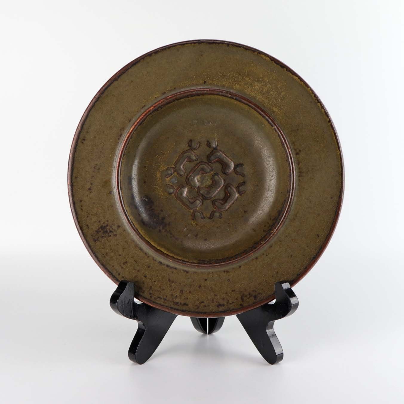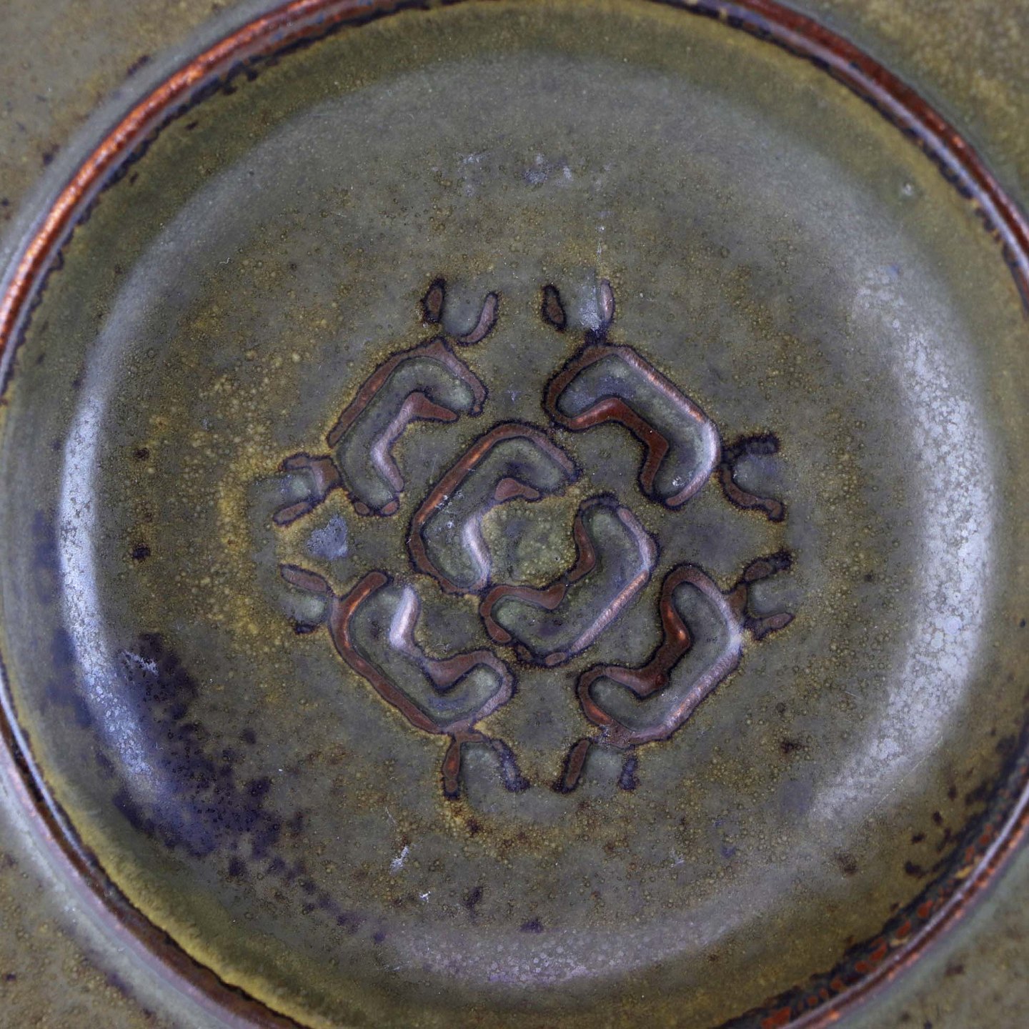 Skål i brunt stentøj med abstrakt mønster i bund. Nr. 226
