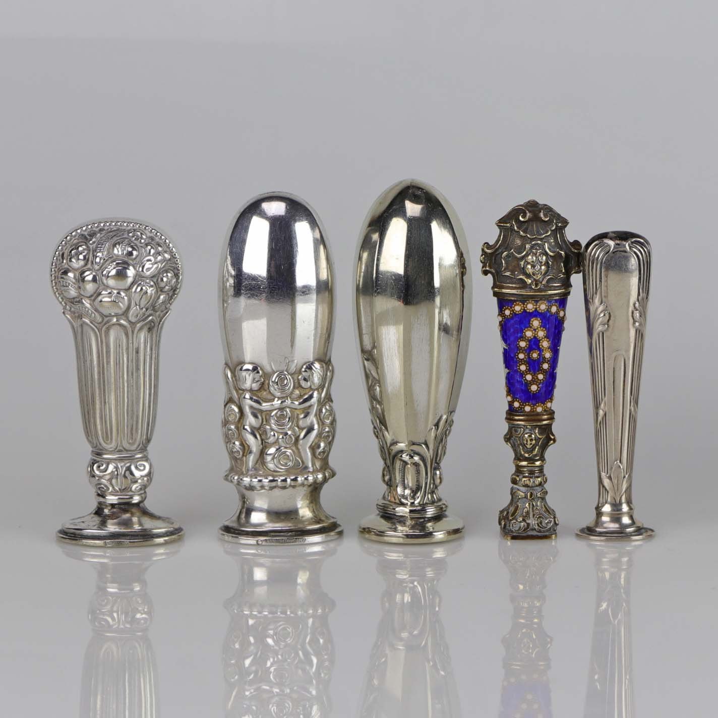En samling af 12 styk signatur stempler i forskellige udformninger og med forskellige signaturer. Fremstillet i træ, metal og sten