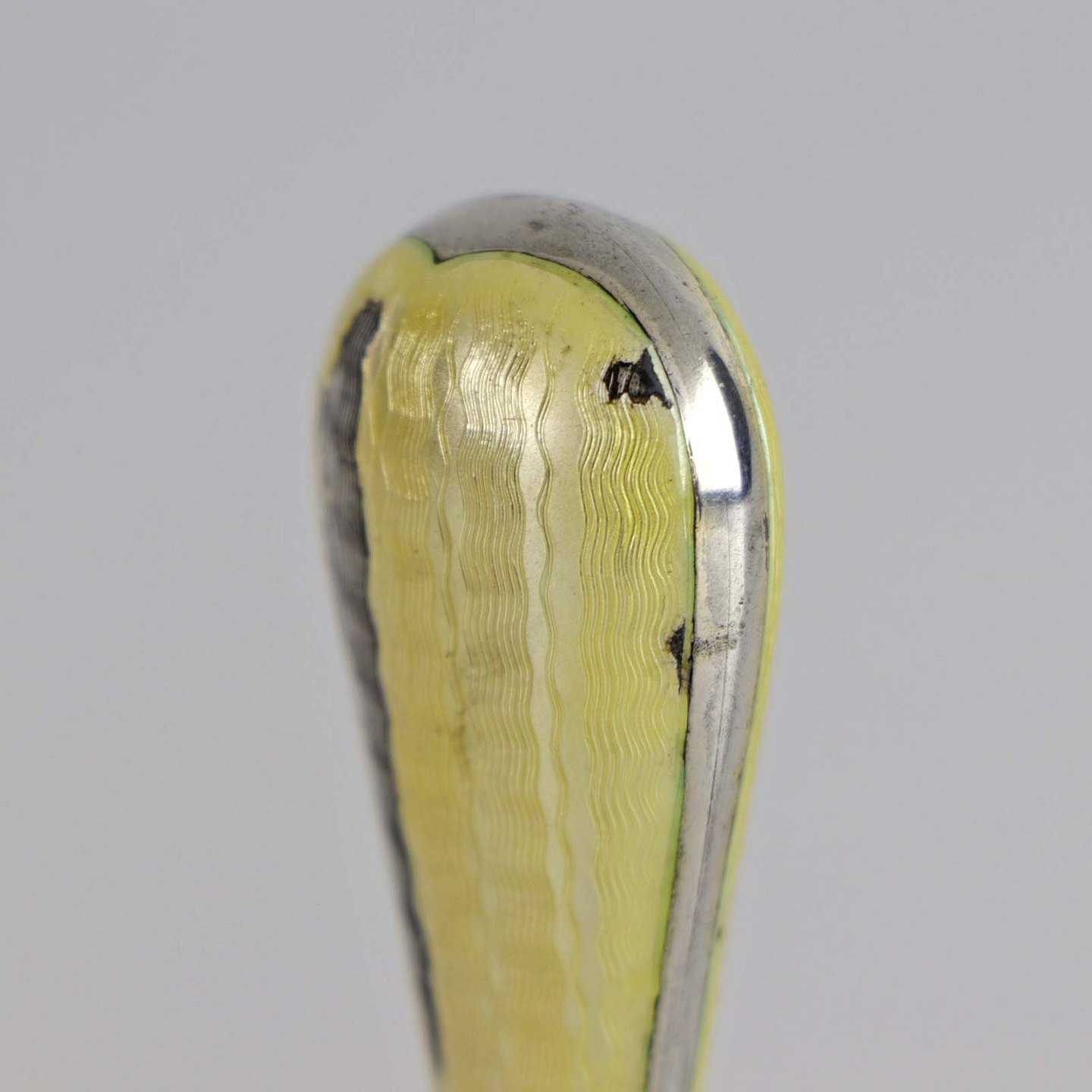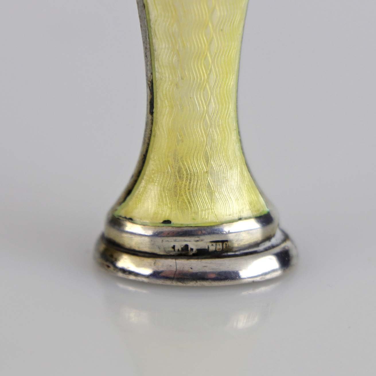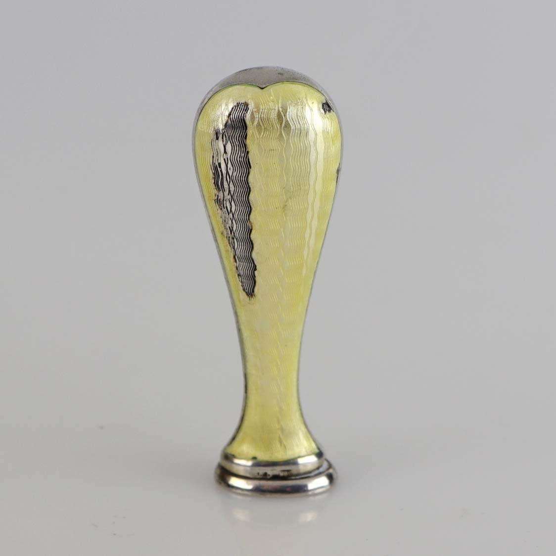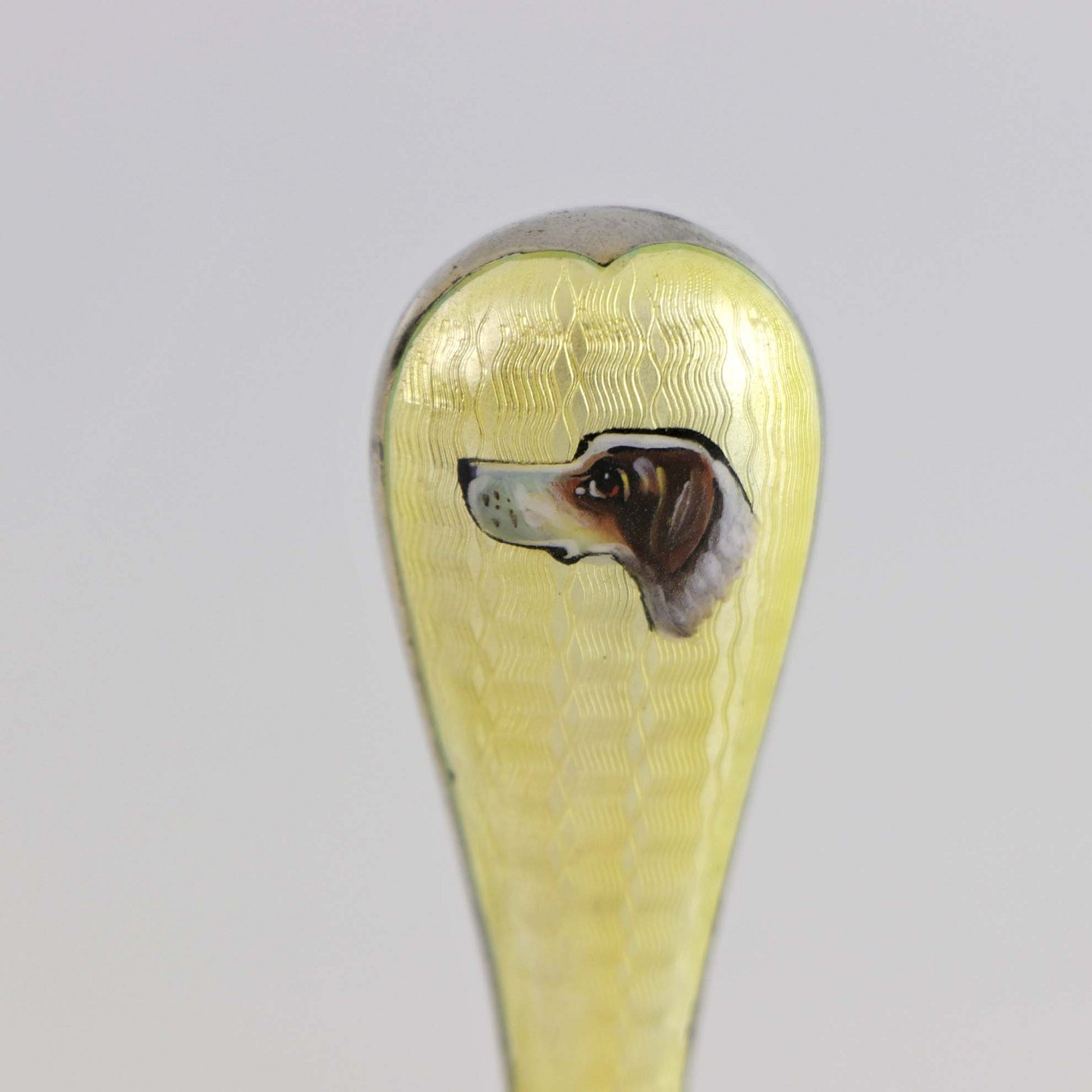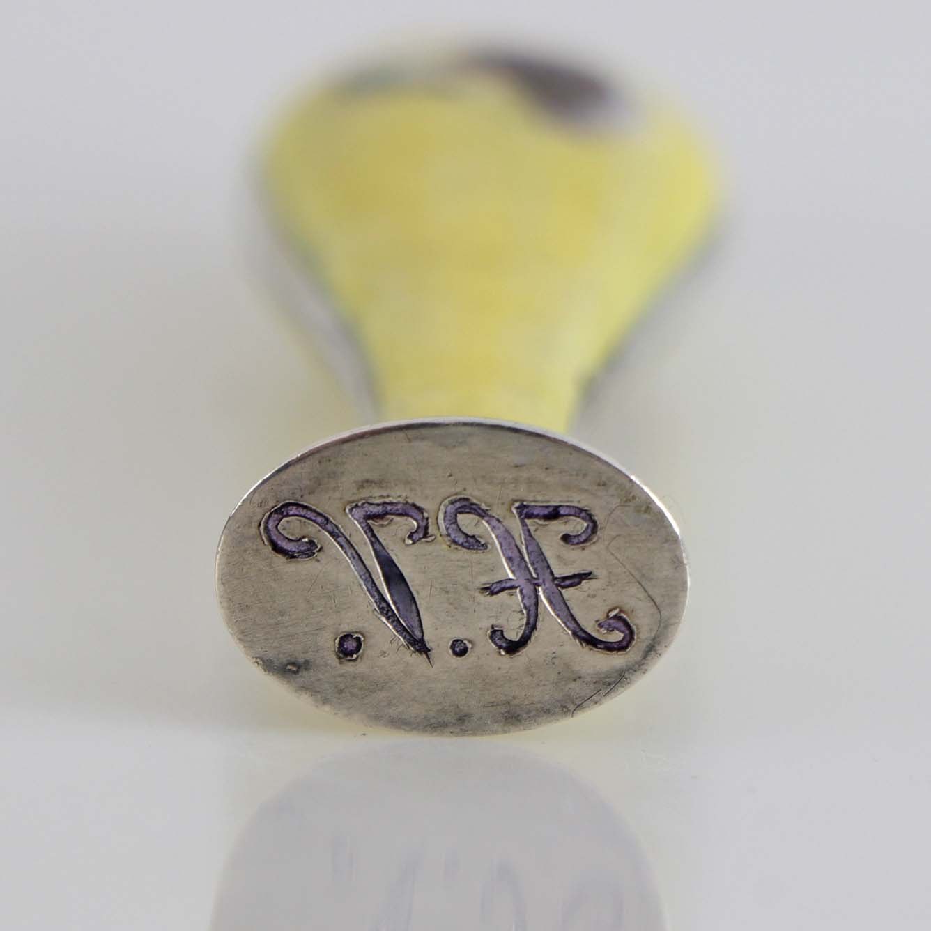 Signatur stempel i sølv med indlagt gul emalje og motivet af en jagthund. Stemplet bærer monogrammet H.V