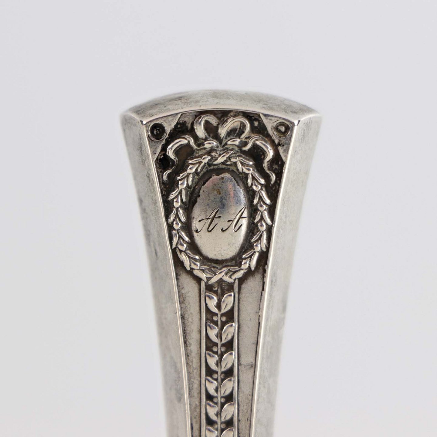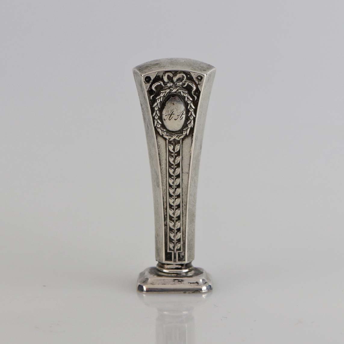 Signatur stempel i sølv med monogrammet A A og dekoration af krans og blade
